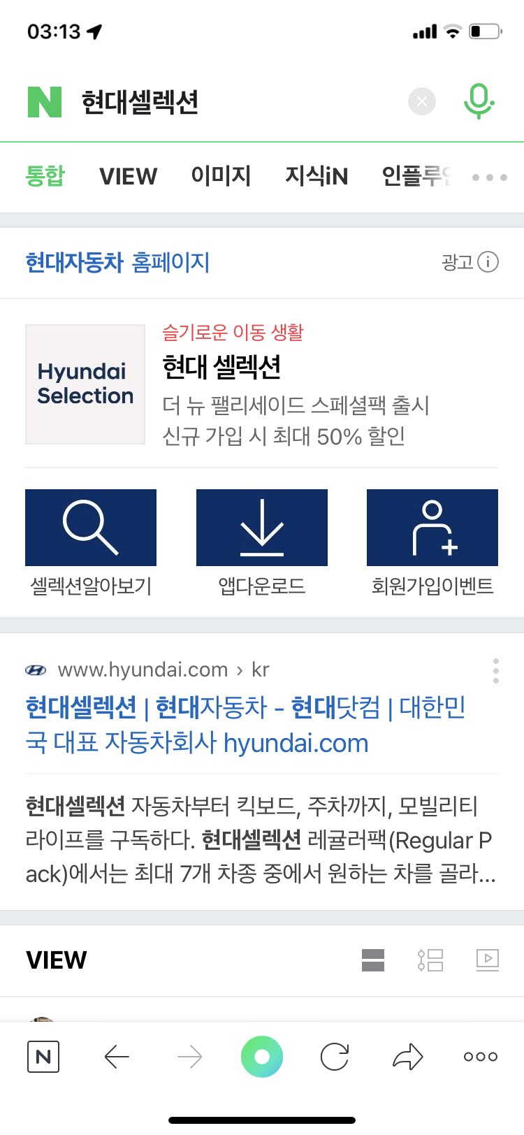 최근 필자는 아반떼N 차량을 타보고 싶었습니다. 그런데 이게 현대 시승 서비스로도 제한적으로 제공되었고 일반 차량이 아니다 보니 쏘카 등 차량 공유 서비스는 물론 일반 렌트 업체에서도 물량이 사실상 없었습니다. 그렇게 새로운 차를 타보고 싶다는 생각이 잊힐 무렵, 우연히 현대 셀렉션의 차량 구독 서비스가 1회에 한해 50%나 할인한다는 것을 알게 되었습니다. 검색하니 여전히 신규가입대상 50% 할인이 적용되어 바로 '현대 셀렉션' 앱을 다운로드하였습니다.