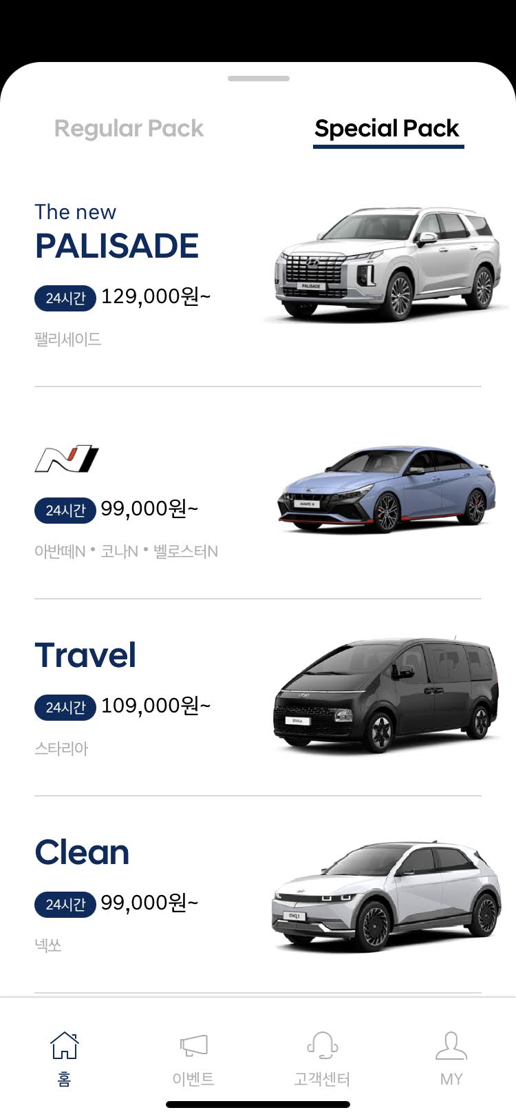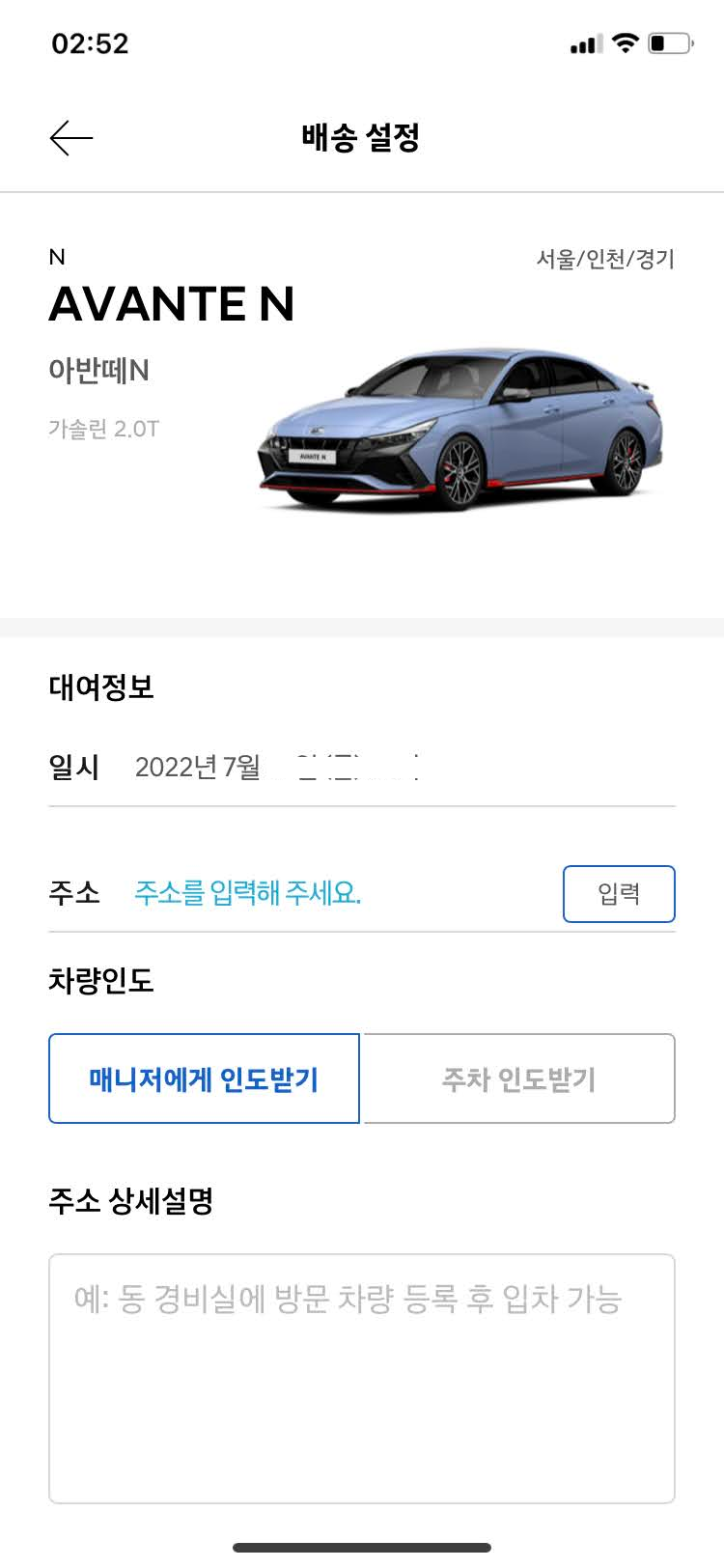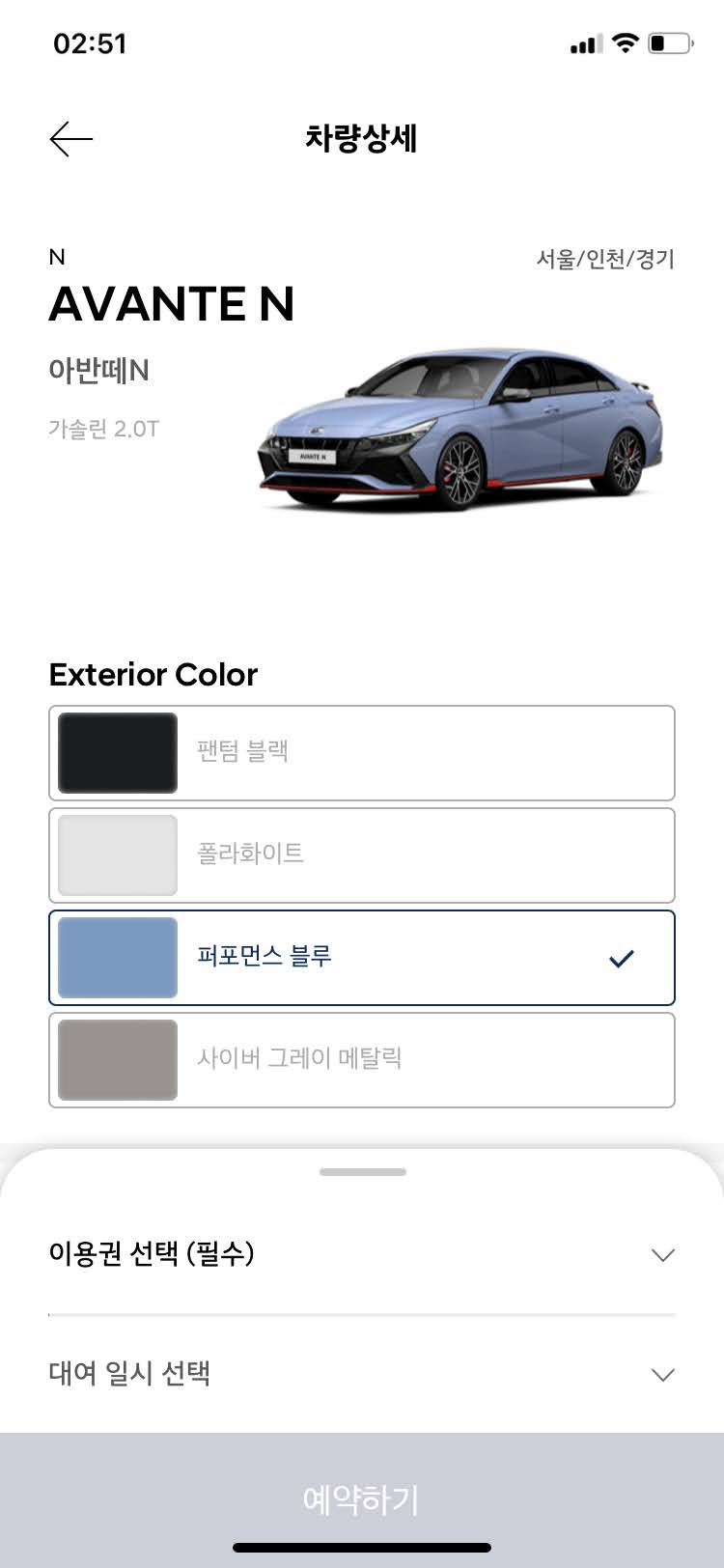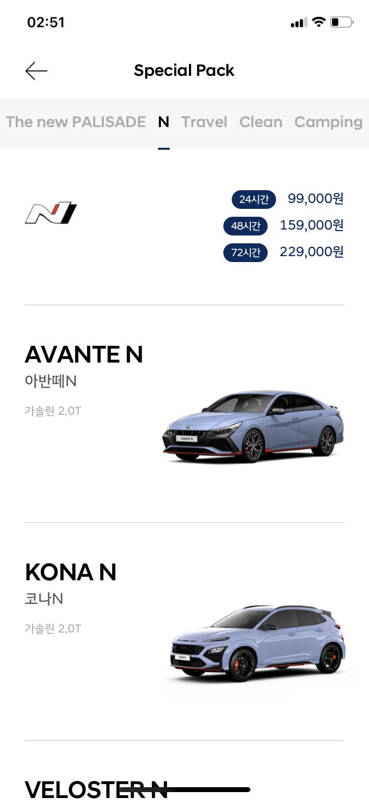 스페셜 팩을 보니 24시간, 48시간, 72시간 기준으로 구독이 가능합니다. 이 경우는 앞선 레귤러 팩과 달리 사실상 단기 렌트인데 아무래도 일반 차량이 아니다 보니 별도의 정책으로 분리된 듯합니다. 필자가 타보고 싶었던 아반떼 N은 물론 코나 N, 벨로스터 N 모두 24시간 기준 9.9만 원이었습니다. 일반적인 렌트, 차량 공유 서비스보다 확실히 비용이 꽤 높지만 중요한 것은 현대 셀렉션이 아니면 사실상 이용이 어려운 차들이라 따지고 보면 엄청난 메리트입니다. 바로 아반떼 N을 선택해봅니다.