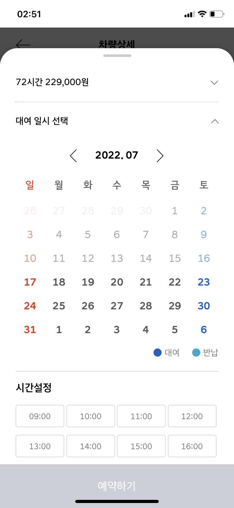 가솔린 2.0T 모델로 제공되며 옵션 역시 지정되어 있었으나 다행스럽게도 일반적인 중상 수준 트림과 옵션이 기본으로 적용되어 있습니다. 색상 역시 자유롭게 선택이 가능하나 기예약건이 있다면 원하는 시간대에 맞추기가 어려우니 색상별로 내가 필요한 시간에 대여가 가능한지 체크하시면 되겠습니다. 시작일, 종료일을 선택한 후 한 시간 단위로 변경할 수 있습니다. 참고로, 대여 기준은 1일 24시간 기준으로 책정됩니다. 즉, 내가 대여일 오전 9시에 빌렸으면 반납일에도 반드시 오전 9시로 설정해야 합니다. 일단 필자는 총 3일 72시간 기준 299,000원으로 구독을 하기로 했습니다. 고급 스포츠카인만큼 장거리를 밤낮으로 N모드로 한번 달려봐야 후회가 없겠죠?