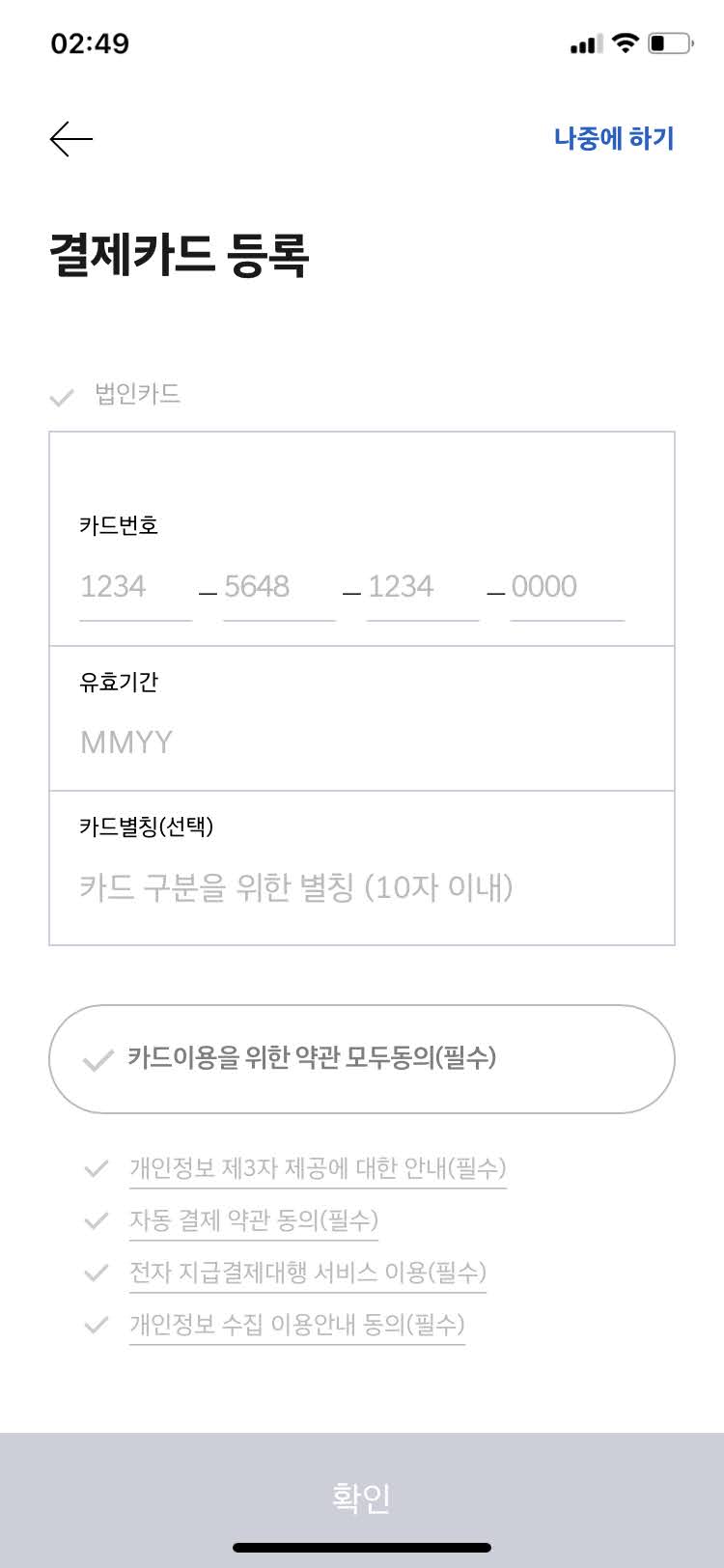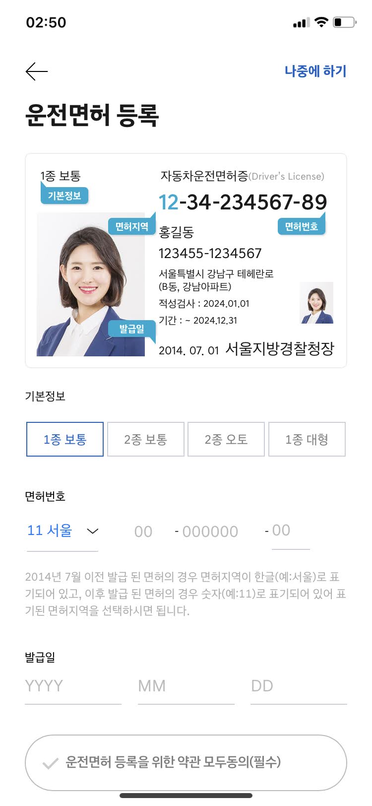 차량을 구독하는 서비스다 보니 결제카드와 운전면허 등록이 필요합니다. 진행해줍니다.