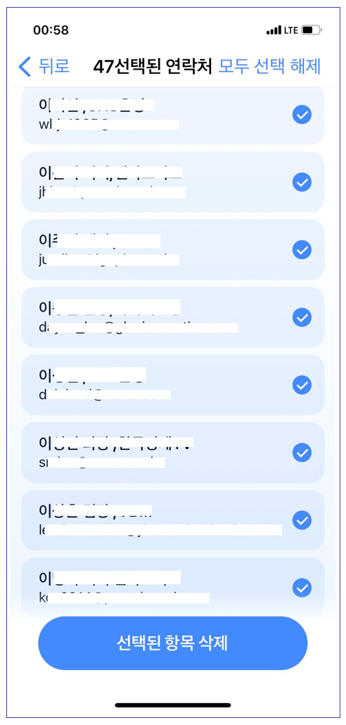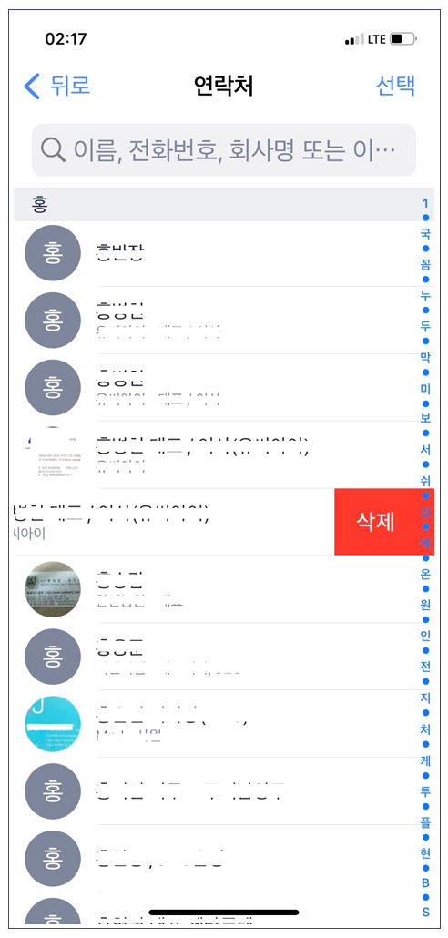 추가로, 아이폰 기본 주소록에서는 연락처 리스트에서 바로 한 번에 또는 연락처를 선택해서 연락처를 지우는 것이 불가능합니다. 하지만, 스마트 클리너에서는 아래와 같이 연락처 리스트에서 바로 스와이프를 통해서 연락처 삭제가 가능하고 선택 기능이 제공되어 위에서 언급해드린 것처럼 병합하기 헷갈리는 것들은 조금만 시간을 내어 하나하나 수동으로 처리하는 데에도 그리 큰 시간이 들지 않습니다.