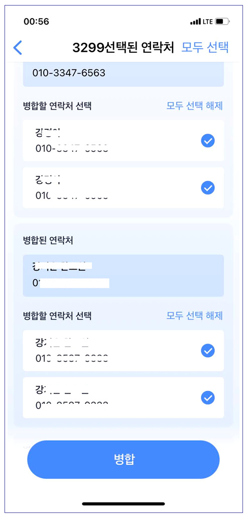 동일한 이름과 동일한 연락처가 자동으로 매칭 되면서 1개의 연락처로 병합을 할 수 있도록 정리해줍니다. 이렇게 정리된 연락처가 총 3,299건이며 클릭을 하면 하나하나 직접 눈으로 체크할 수 있도록 병합될 연락처를 먼저 보여줍니다. 그런데 여기서 주의하셔야 할 것이 있습니다. '리멤버'같은 명함 등록 서비스를 이용할 경우 이름과 휴대폰은 다르지만 회사 대표번호, 회사 내선번호가 동일한 번호들이 많이 뜨는데 이렇게 하나라도 주소록에서 동일한 정보가 검출되면 모조리 다 병합 대상으로 인식되게 됩니다. 즉, 이름과 휴대폰 번호는 다르지만 회사 대표번호, 회사 내선번호가 다르다면 한 땀 한 땀 수동으로 병합 여부를 설정해줘야 합니다. 이 주의사항을 모르고 그냥 병합을 누르게 되면 하나의 회사에서 받은 모든 명함은 1명의 연락처로 모조리 병합이 됩니다. 대신 '불완전한 연락처'는 기능이 깔끔합니다. 이메일 주소만 있거나, 이름이 없거나, 번호가 없는 주소록 내역을 보여주는데 확인하고 필요한 주소록 정보는 삭제해주시면 되겠습니다.