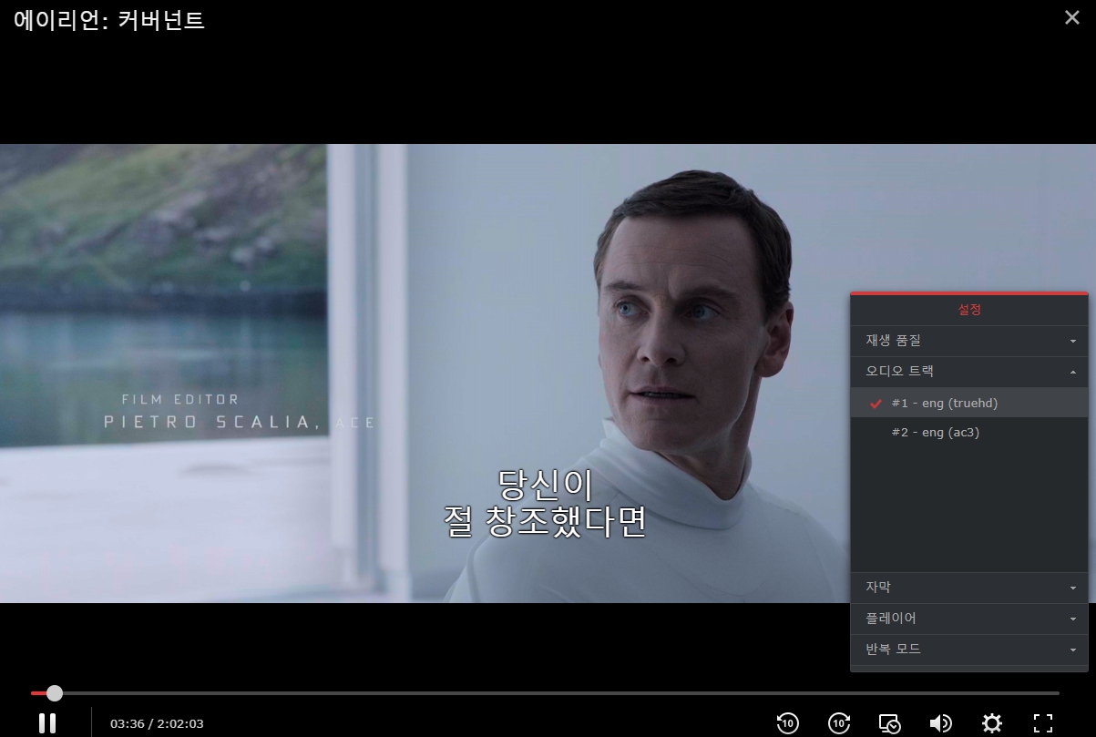 하지만 위 영화파일에는 오디오 코덱이 3개가 존재합니다. AAC, TRUEHD, AC3. 오디오트랙을 TRUEHD로 변경해보니 역시나 재생이 되지 않았습니다.