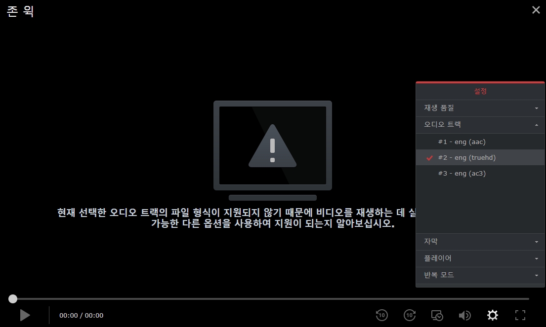 아래와 같이 시놀로지 비디오 스테이션에서 TRUEHD 7.1 채널 오디오를 가진 에이리언 커버넌트를 클릭해보니 오디오가 지원하지 않는다는 이유로 영상이 재생되지 않았습니다.