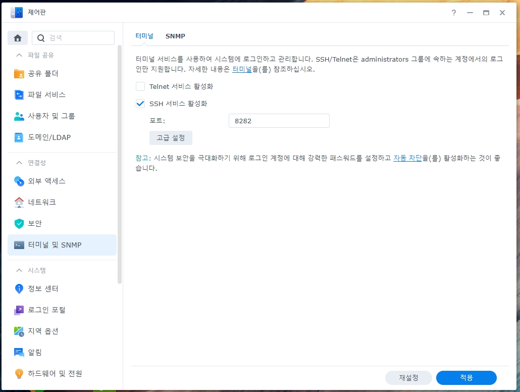 ffmpeg가 설치가 되면 말 그대로 통합 코덱이 설치가 된 것입니다. 하지만, 비디오 스테이션과 FFMPEG가 업데이트될 때마다 매번 코덱을 패치해줘야 하는 번거로움이 생깁니다. 이러한 번거로움이 없도록 위에서 안내해드린 것처럼 자동화 패치 스크립트를 적용해보겠습니다. 먼저 시놀로지 비디오 스테이션 서비스를 중지시키신 후, 패치를 위해서는 시놀로지 NAS 권한을 획득해야 해서 SSH 서비스를 활성화해야 합니다. '제어판 > 터미널 및 SNMP > 터미널 > SSH 서비스 활성화'를 체크합니다. 포트번호는 안 쓰는 포트로 자유롭게 구성하셔도 됩니다.