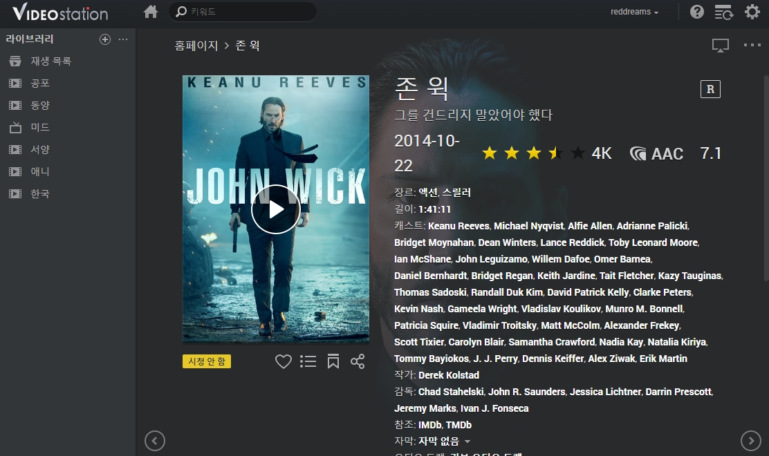 이번에는 AAC 7.1 채널이 메인 소스로 되어 있는 존윅을 재생해보았는데 정상적으로 재생이 되었습니다. AAC는 시놀로지에서 기본적으로 지원하는 포맷이라서 당연히 재생이 잘 되는 것입니다.