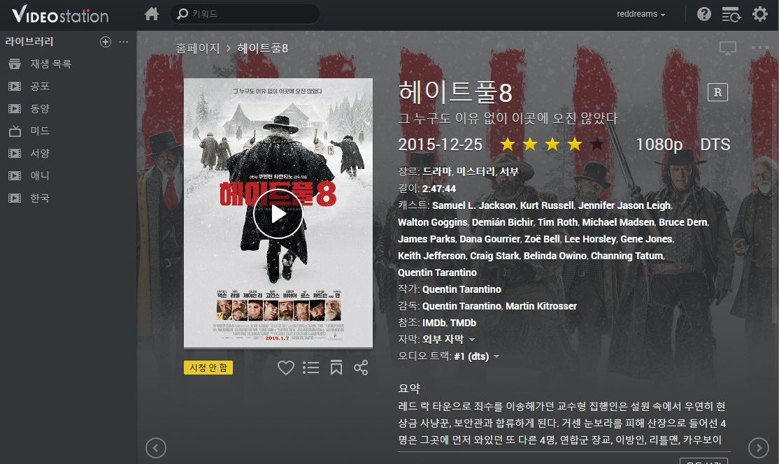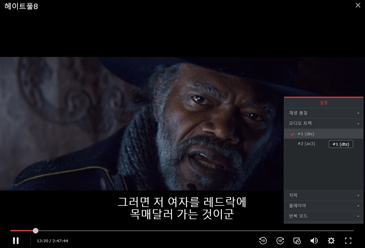 마찬가지로 DTS 오디오 코덱을 가진 헤이트풀8을 재생해보아도 역시나 재생이 되지 않았습니다.