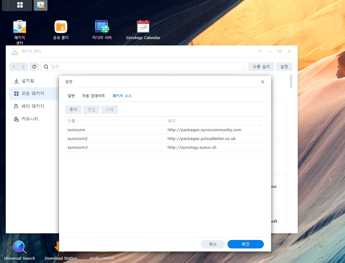 오디오 코덱을 설치하기 위해서는 시놀로지 나스에 추가 패키지를 설치해줘야 합니다. '패키지 센터' > 설정 > 패키지 소스'메뉴에서 '추가'버튼을 눌러서 이름과 위치를 아래와 같이 적어줍니다. 그럼 아래와 같이 패키지 소스에 리스트가 추가됩니다. (필자는 다른 활용을 위해 3개가 입력된 상태입니다.)