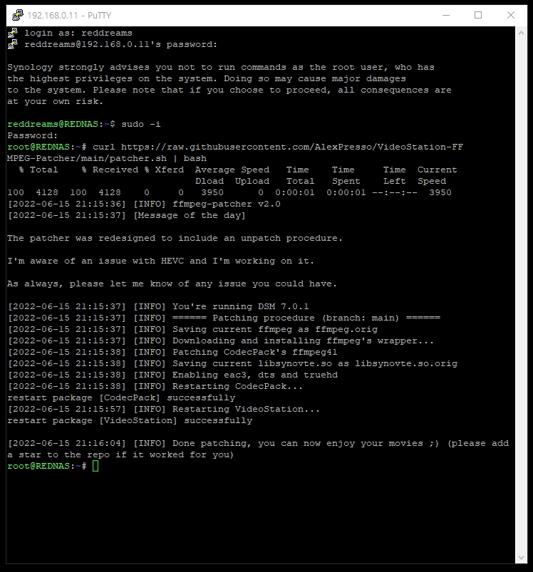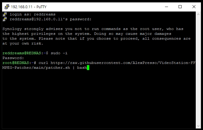 [ curl https://raw.githubusercontent.com/AlexPresso/VideoStation-FFMPEG-Patcher/main/patcher.sh | bash ]를 입력해서 자동화 패치를 적용해줍니다.