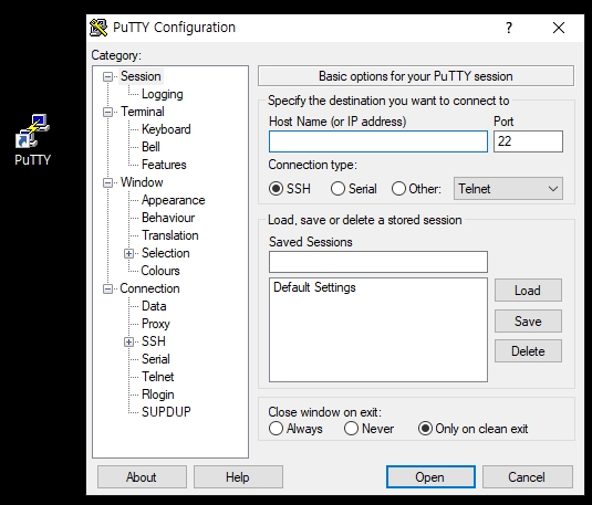 2. putty 실행 및 IP와 포트번호 입력 후 실행