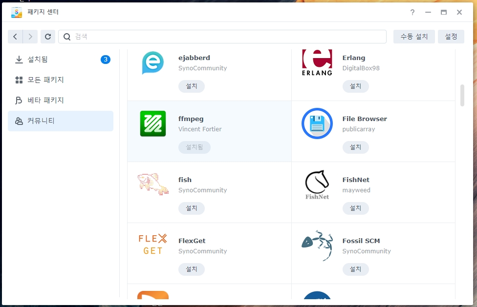 위에서 패키지 소스를 등록하고 나서 '패키지 센터 > 커뮤니티'에 가보면 안보이던 것들이 노출되기 시작합니다. 여기서 'ffmpeg'를 확인하고 설치를 눌러줍니다. 만약에 이 단계에서 보안상의 이유로 FFMPEG설치가 되지 않는다면 '패키지 센터 > 설정 > 일반 > 신뢰 수준 > '시놀로지 및 신뢰할 수 있는 게시자'로 체크를 하시기 바랍니다.