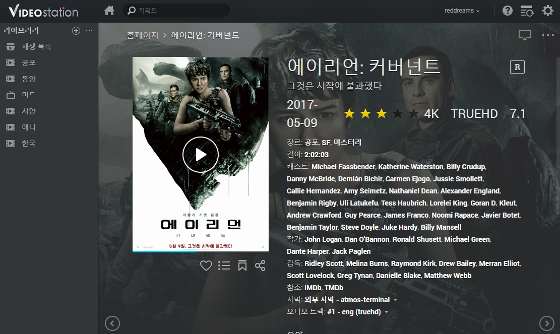자 모든 작업이 끝났으니 다시 비디오 스테이션을 재시작한 후 재생이 안되던 영화를 재생해봅니다. truehd, dts 모두 정상적으로 잘 재생이 되었습니다.