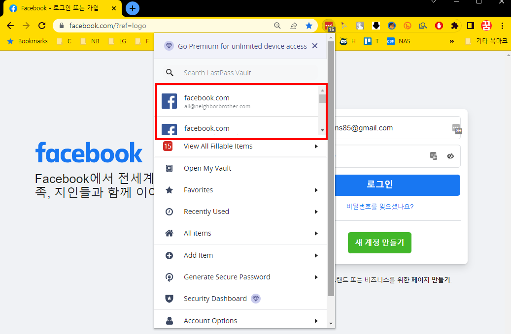 라스트 패스는 동일한 서비스에 여러 개의 멀티 계정 입력이 가능합니다. 필자의 경우 페이스북 계정은 관리 목적으로 여러 개가 있는데 아래 보시는 것처럼 총 9개의 계정이 라스트 패스에 저장되어 있어서 원하는 대로 계정을 선택해서 로그인을 진행할 수 있습니다.