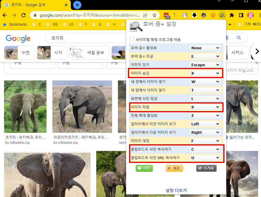 호버 줌은 단순히 썸네일 이미지를 크게 보여주는 것 말고도 다음과 같은 유용한 기능을 함께 제공해줍니다. 마우스를 움직일 때마다 매번 원본 이미지가 뜨는 것이 귀찮을 경우 X를 누르고 있으면 작동하지 않습니다. 줌이 된 이미지를 즉시 다운로드하려면 S를 누르면 바로 내 컴퓨터로 저장이 됩니다. C 버튼을 누르면 사진이 복사되고, U버튼을 누르면 사진 URL이 복사됩니다.