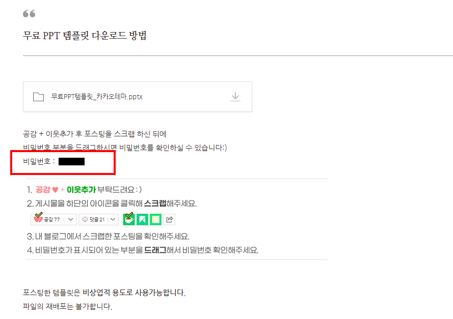 PPT 파일을 다운로드하고 싶어서 검색을 통해 어느 블로그에 갔더니 아래와 같이 PPT에 입력된 비밀번호를 확인하기 위해서는 블로그 본문에 검정 배경으로 설정된 부분을 드래그해서 비밀번호를 확인하라고 합니다. 해당 블로그는 '마우스 우클릭 금지'가 설정된 페이지였기에 마우스를 아무리 드래그해도 작동하지 않으며 블로거의 의도대로 스크랩을 통해 내 블로그로 글을 넘겨야만 마우스 드래그가 가능해지죠. 개인적으로 공유와 스크랩을 늘리기 위한 이러한 방식의 홍보 또는 파일 제공을 긍정적으로 보진 않고 있지만 많은 분들이 공감, 이웃추가, 스크랩을 진행해주고 있음을 알 수 있습니다.
