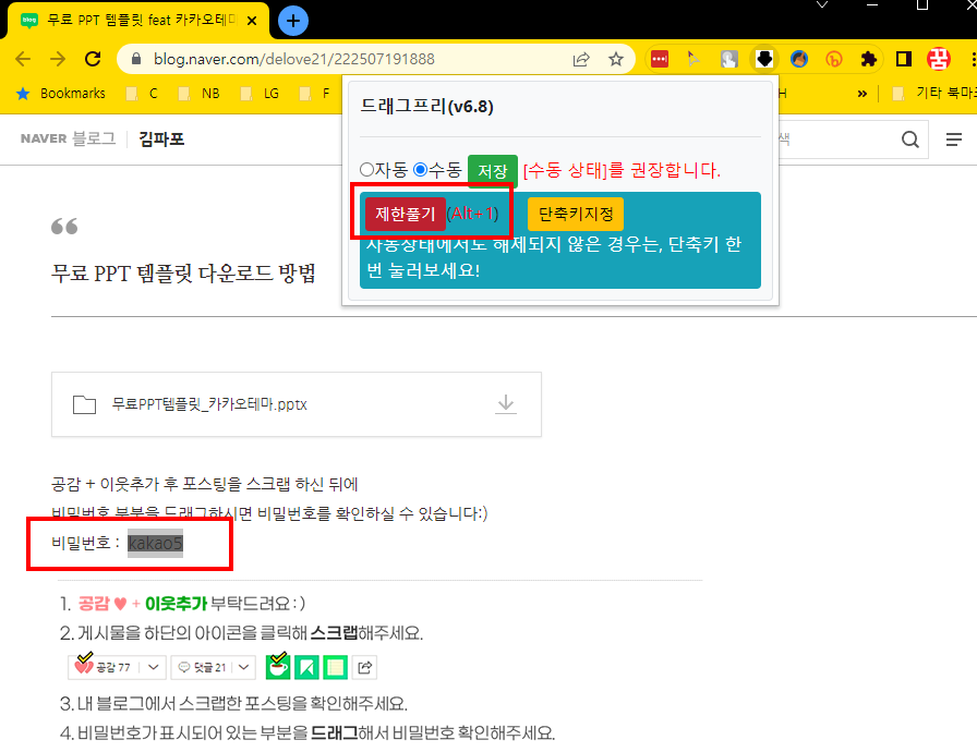 드래그 프리 확장 프로그램을 설치하면 드래그를 포기하거나, 껄끄럽게 스크랩 후 이용하지 않아도 됩니다. 드래그 프리 확장 프로그램에서 '제한 풀기' 버튼을 누르는 순간 해당 페이지의 마우스 우클릭 제한 기능이 무력화되어 자유롭게 마우스를 드래그할 수 있기 때문이죠. 물론, 예시에 있는 콘텐츠처럼 블로거가 열심히 만든 콘텐츠를 아무런 노력 없이 확장 프로그램을 통한 클릭 한 번만으로 퍼가는 것 역시 바람직하지 않으므로 이 기능은 웹페이지 유저의 의도와 노력을 충분히 고려해서 조심스럽게 활용해주시기 바랍니다.