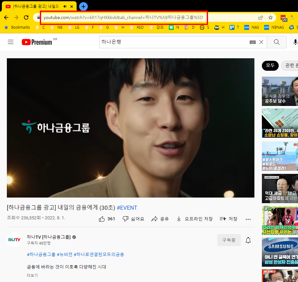 아래와 같이 유튜브 영상을 보던 중 이 url을 공유하고 싶어 졌습니다. 물론, 유튜브 하단에 '공유'버튼이 있지만 이 공유 버튼은 유튜브에서 영상 콘텐츠 하나하나씩 부여하는 기본 공유 주소입니다. 즉, 최종 도착지는 같을지 몰라도 주소표시줄에 노출되는 url과 전혀 다르다는 점입니다. 또한, 상단의 주소를 복사해서 카톡 등에 공유하게 될 경우 생각보다 긴 url주소로 지저분하기도 하며 신뢰도도 없게 됩니다. 특히, 한글이 url에 포함될 경우 이상한 영어 숫자가 조합된 문자로 다시 치환이 되어 더 불편합니다.