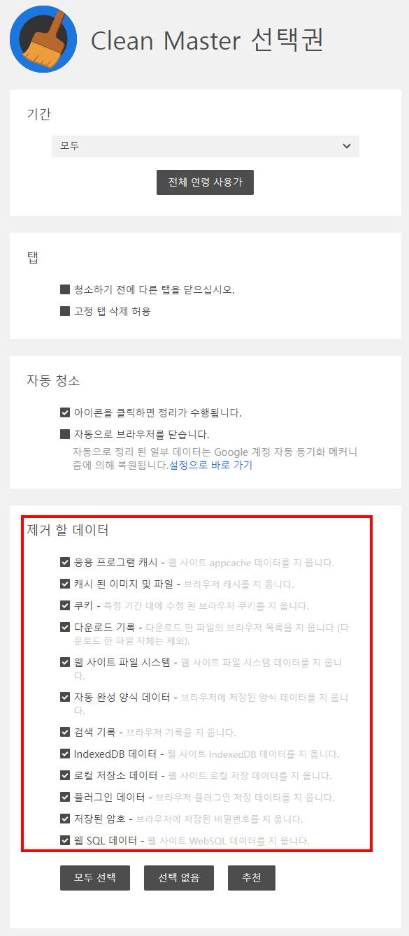 아래와 같이 Clean Master는 실행 버튼을 클릭할 때 작동될 조건을 설정할 수 있습니다. 기간 설정, 탭 닫기, 자동청소 기능은 물론 제거할 데이터를 사용자가 자유롭게 선택할 수 있습니다. 물론 사이트 데이터 등 일부 데이터는 클린 마스터로 제거되지 않겠지만 최소 필수 조건으로 제거해야 할 인터넷 사용 기록들은 대부분 제거가 되므로 확실히 인터넷 이용 후 클릭 한 번만으로 도 개인정보를 정리하는 목적으로는 매우 효과적입니다.