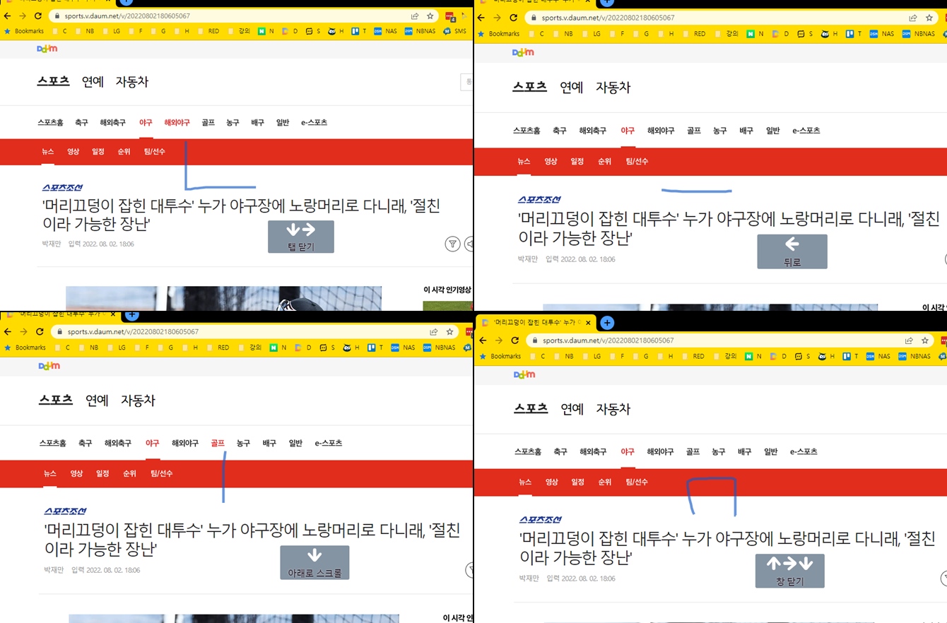 아래 보시는 것처럼 인터넷을 통해 뉴스를 보고 있는데요. 마우스를 좌 클릭하고 니은 모양을 그리니 '탭 닫기'가 뜹니다. 마찬가지로 왼쪽으로 드래그하니 '뒤로', 아래로 드래그하니 '아래로 스크롤', 집 모양을 그리니 '창닫기' 액션 창이 뜹니다. 바로 탭 닫기, 뒤로 가기, 밑으로 스크롤하기, 앞으로 가기, 다음 탭 넘기기 등 인터넷 이용에 꼭 필요한 각종 액션 기능을 마우스 제스처로 이용할 수 있도록 해주는 확장 프로그램입니다.