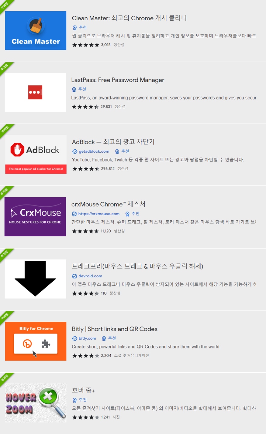 크롬의 확장 프로그램은 너무나도 많습니다. 하지만, 전부 다 이용한다면 결국 브라우저 자체의 속도 저하를 불러일으킬 것이라 최대 10종 정도로 엄선해서 활용하실 것을 추천드립니다. 필자의 경우 필수 확장 프로그램은 10개 정도로 상시 On으로 해놓고, 주 또는 월에 반드시 한 번씩 필요한 것들은 OFF 해놓고 필요할 때 확장 프로그램 설정 메뉴에서 On 해서 사용 중입니다. 오늘 추천드린 확장 프로그램으로 여러분들의 생산성, 효율성이 충분히 향상되길 바랍니다. 참고하실 수 있도록 아래 크롬 웹스토어 주소와 함께 오늘 소개해드린 7종의 확장 프로그램 앱 화면을 보여드리니 프로그램 다운로드 및 설치에 참고해주시기 바랍니다.
