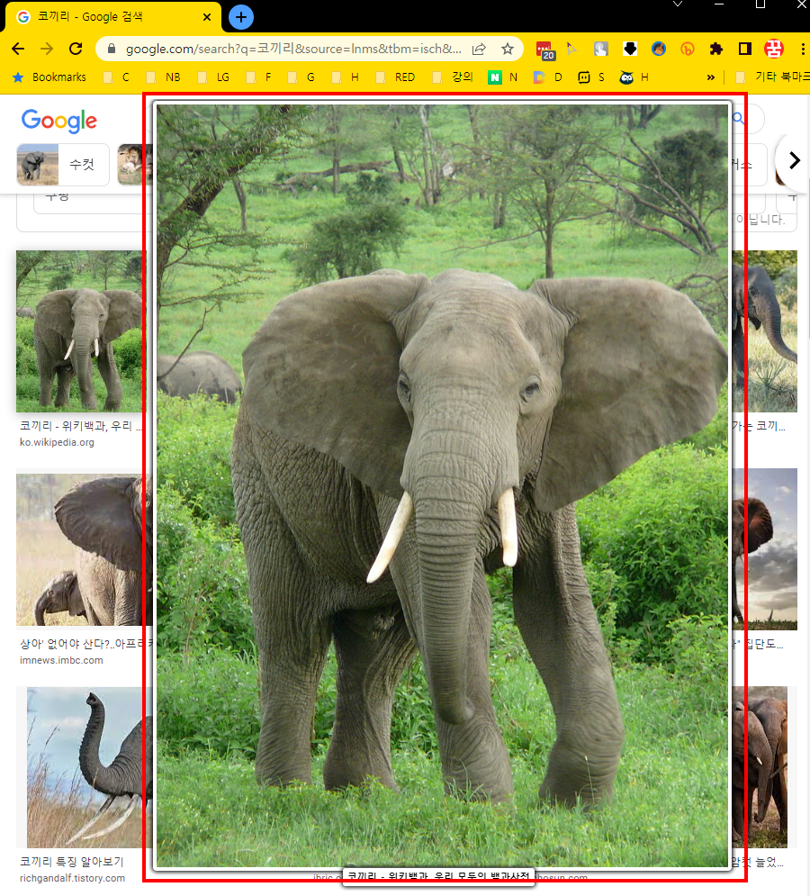 그냥 마우스를 썸네일 이미지 위에 가져다 놓으면 자동으로 원본 사이즈의 레이어 팝업이 띄워집니다. 클릭할 필요도 없이 검색된 이미지의 원본 크기를 마우스를 1초만 갖다 놓는 것만으로 확인이 가능해진 것입니다.