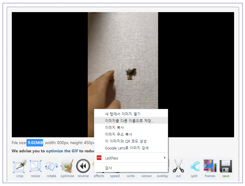 약 7초 분량의 동영상을 GIF로 변환하였습니다. 기존 대비 사이즈를 1/2 가까이 줄이고, FPS도 10으로 작게 줄인다고 했는데 이 GIF 파일의 크기가 원본 동영상보다 더 큰 9Mb입니다. 그만큼 GIF는 이미지 크기와 FPS에 따라 용량이 어마어마하게 커지니 사이즈를 충분히 잘 축소하고, 변환할 구간을 잘 선택해주는 것이 좋습니다.