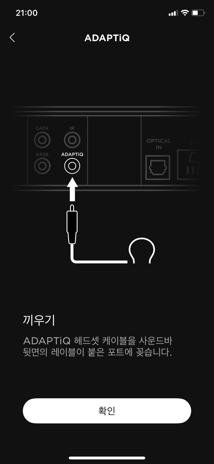 아무튼 다음으로 넘어가서 공간음향보정 작업입니다. BOSE에서 특화된 기술이라고 자랑하는 것인데 말 그대로 내가 위치한 공간을 파악하고 최적의 사운드 세팅을 해준다는 것입니다. 박스에 동봉된 헤드폰 같은 녀석을 머리에 꼽고, 잭을 사운드바 뒷면의 ADAPTIQ에 꼽기만 하면 됩니다.