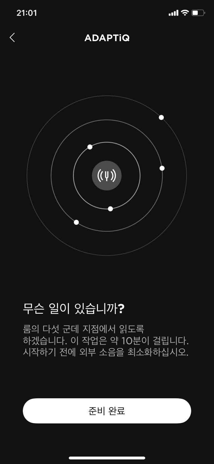 이제 총 5군데에서 내 위치와 사운드 소리를 측정하는 작업이 시작되는데 대부분 쇼파 위 최적의 장소, 쇼파 옆좌석, 쇼파 밑 등 대충 TV 앞에 앉거나 누워있는 상태로 진행해주시면 되겠습니다. 참고로, 이 과정에서 조금이라도 잡소리가 들리면 다시 작업이 되니 반드시 정숙을 요한 후 진행해주시기 바랍니다. 약 10분 후 드디어 BOSE SMART SOUNDBAR 900의 모든 세팅 작업이 끝났습니다.