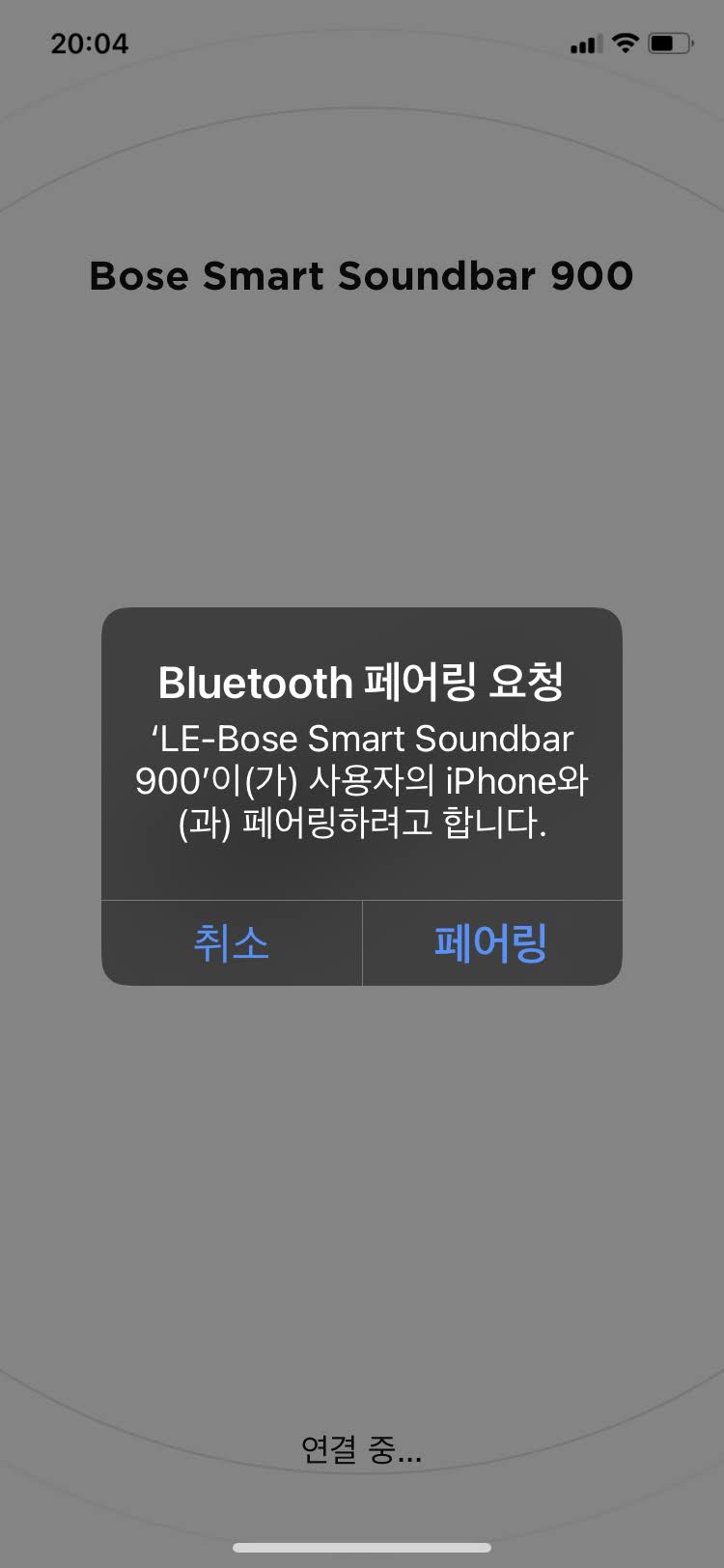 사운드바가 정상적으로 설치되고 전원을 연결했다면 화면에 나오는 대로만 따라 하면 아래와 같이 장치가 검색이 바로 됩니다. 블루투스로 사운드바와 페어링을 시도합니다.