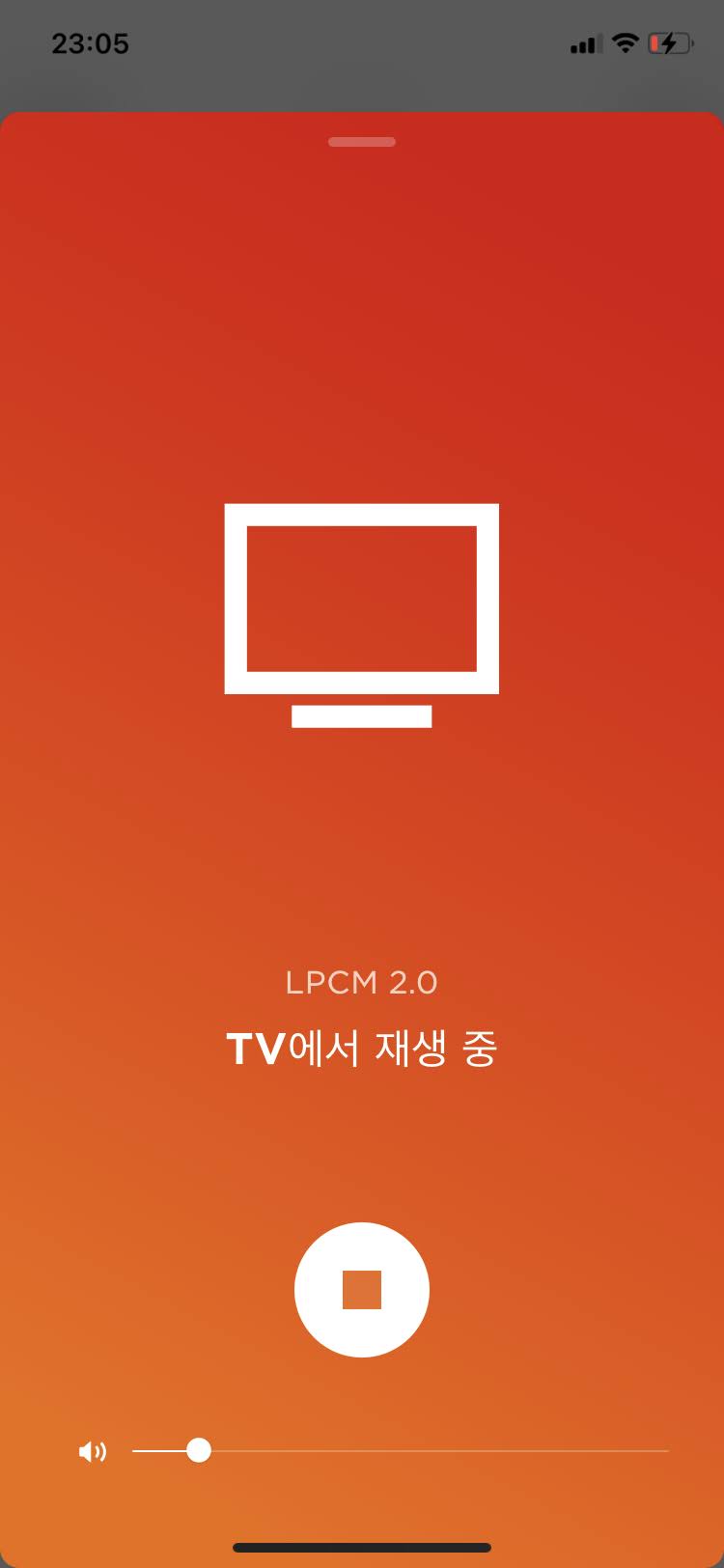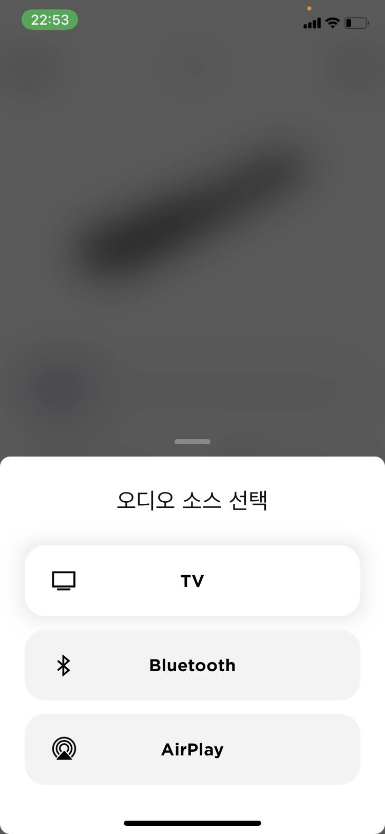 먼저 외부 소스를 받지 않고 TV와 직결된 스피커 출력 시에는 TV에서 재생 중이라는 표시와 함께 오디오 정보가 상단에 노출됩니다. 지금은 일반 TV 재생 상태라 LPCM 2.0이라고 뜨는데 만약에 넷플릭스 등에서 ATMOS 음원의 영화를 시청 중이라고 한다면 상단 음원 정보가 ATMOS로, 5.1채널 서라운드 음원 영화를 재생한다면 PCM 5.1 등으로 표현이 될 것입니다. 추가로, 블루투스를 연결할 경우에는 아래와 같이 블루투스 표시와 함께 아티스트명과 제목명이 노출됩니다만 블루투스는 거의 이용 안 할 것이므로 바로 패스합니다.