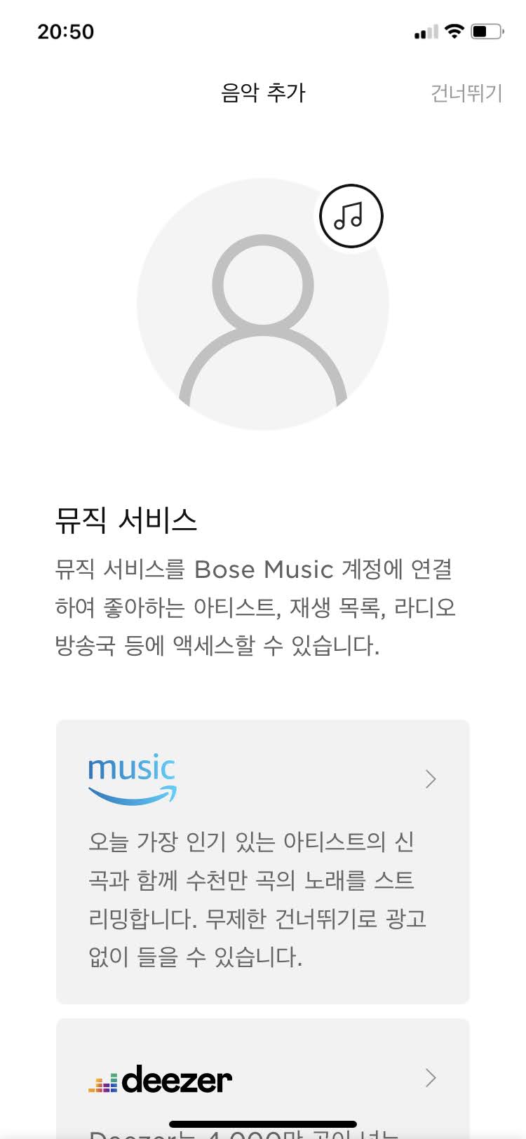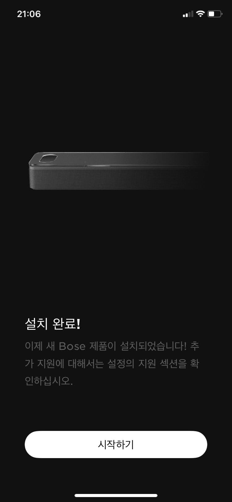 먼저 스마트사운드바 900을 활용하기 위해서는 BOSE MUSIC앱 설치가 필수적입니다. 앱을 설치하고 실행을 하며 필수적으로 계정을 생성해주시기 바랍니다. 앱 실행 및 로그인이 완료되었으면 '새 제품 설치'를 클릭합니다.