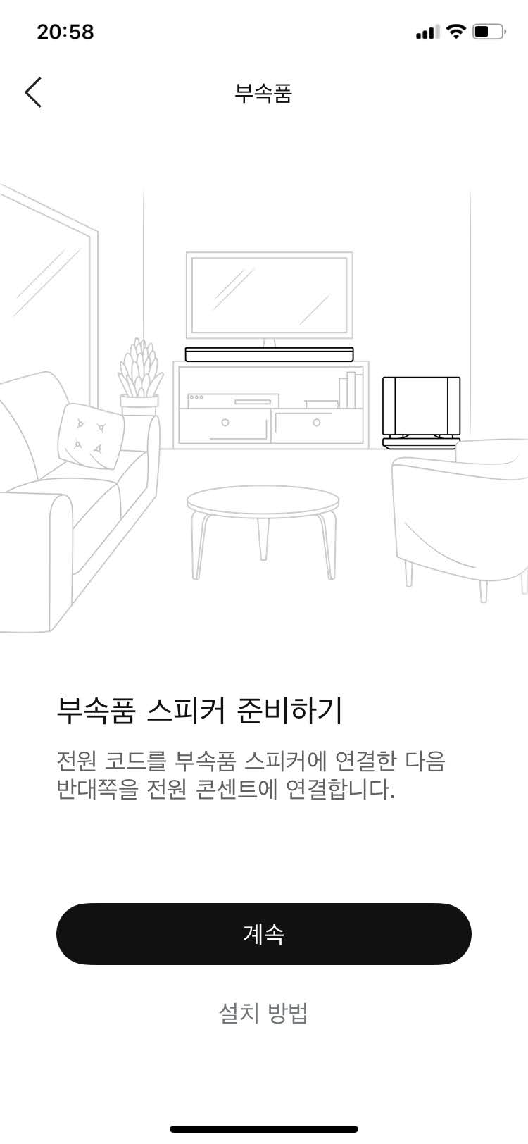 이젠 부속품을 설치할 차례입니다. 스마트사운드바 900 단품만 구입하신 분들이라면 바로 패스하시면 되고 혹시라도 베이스 모듈, 서라운드 모듈을 함께 구입하셨거나 기존에 있었다면 이 단계에서 '예'를 눌러서 부속품을 연결하시면 되겠습니다. 모두 무선 연결인만큼 전원 뺏다 꼽고 '설치 방법' 눌러서 따라 하면 어렵지 않게 부속품 연결이 가능할 것입니다.
