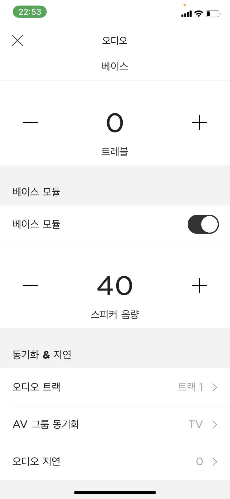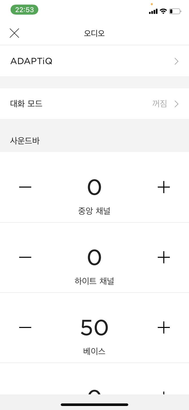'오디오' 버튼은 말 그대로 오디오 설정을 조작할 수 있습니다. 사운드바의 음량은 물론 저음, 중음, 고음을 단계별로 조정할 수 있습니다. 필자는 저음을 좋아해서 베이스만 50으로 설정해놓고 사용하는데 개인의 취향에 맞춰서 설정하시면 되겠습니다. 추가로, 필자의 경우 별도의 베이스 모듈도 있어서 이 모듈도 40으로 설정합니다. 이렇게 설정할 경우 울림이 생각보다 심한데 박진감 넘치고 웅장한 효과로는 그 어떤 사운드바로 따라올 수 없는 압도적인 성능을 발휘해줍니다. 중간중간 일반 TV를 재생하거나, 뉴스나 라디오 등을 들을 때는 따로 중음, 고음을 올리지는 않고 '대화모드'만 ON/OFF로 조정하면서 활용합니다.