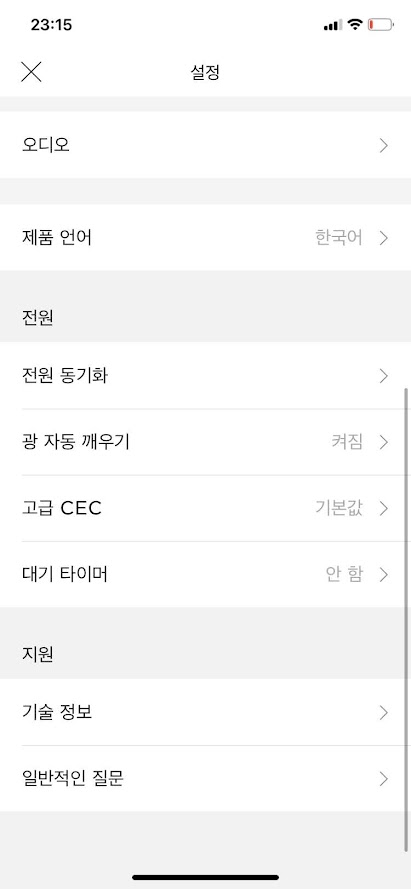 앱 설정 화면을 보면 아래와 같이 다양한 기능이 제공됩니다. 제품 이름, 공유 기능, 부속품 스피커 추가 연결 또는 제거, 음성비서 서비스, 오디오 설정, 제품 언어를 비롯해서 전원 동기화, 광 자동 깨우기, CEC설정 등이 있습니다. HDMI 연결이라 기본적으로 오디오 신호를 받을 때 스피커가 켜지므로 광 자동 깨우기는 설정할 필요가 없습니다. CEC의 경우 간단히 말해서 TV와 연동되어 스피커도 자동으로 꺼지고 켜지게 해주는 설정인데 일단 필자는 기본값인데도 잘 작동을 합니다. (TV를 끄면 사운드바도 자동으로 꺼진다는 소리로 이 CEC기능은 LG는 Simplink, 삼성은 Anynet+ 등의 이름으로 불리기도 합니다.) 혹시라도 작동이 안 되신다면 CEC 옵션을 한 번씩 바꿔보시고 그래도 안되면 TV의 CEC기능이 켜져 있는지, TV의 디지털 출력 오디오를 pass-through로 설정했는지 체크해주시기 바랍니다.