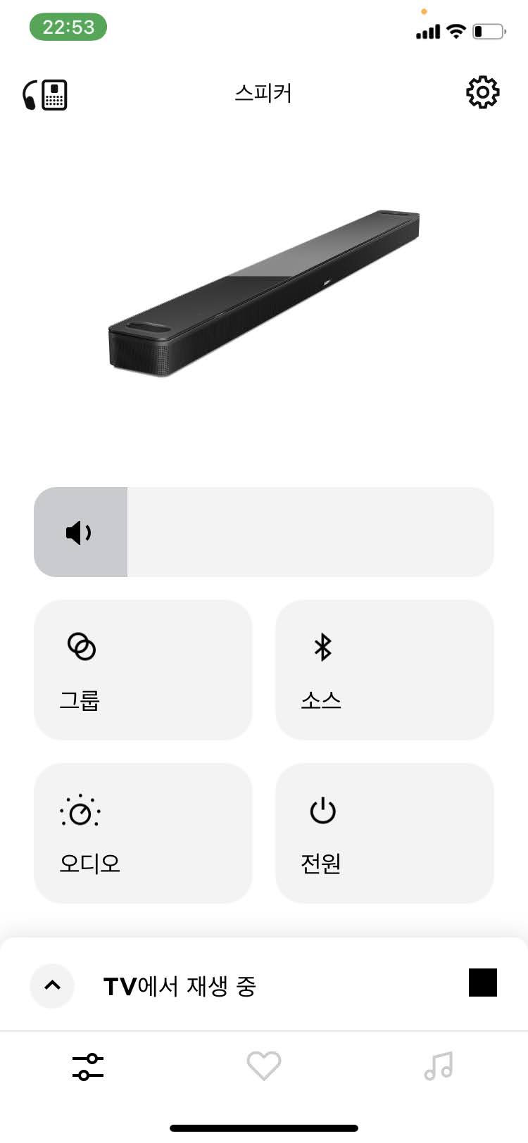 이제 빠르게 BOSE MUSIC 앱을 소개해드리겠습니다. 상단에는 스피커, 중앙에는 볼륨 조절 바, 그 하단으로는 그룹, 소스, 오디오, 전원 버튼이 존재합니다. '그룹'은 BOSE 스마트 스피커, 헤드셋이 있다면 그룹으로 묶어서 동시 재생, 재생 넘기기 등을 할 수 있습니다. '소스'는 TV, 블루투스, 에어플레이 등 말 그대로 음원 소스를 선택하는 버튼인데 사실 이 버튼도 의미가 없는 게 이미 스마트폰 등에서 소스 작업을 할 것이라 미리 선택할 목적으로 활용되진 않고 이미 블루투스로 음악을 재생 중인 상태에서 TV 소리를 듣고 싶을 경우 소스를 변경하는 목적으로 이용하시면 됩니다.