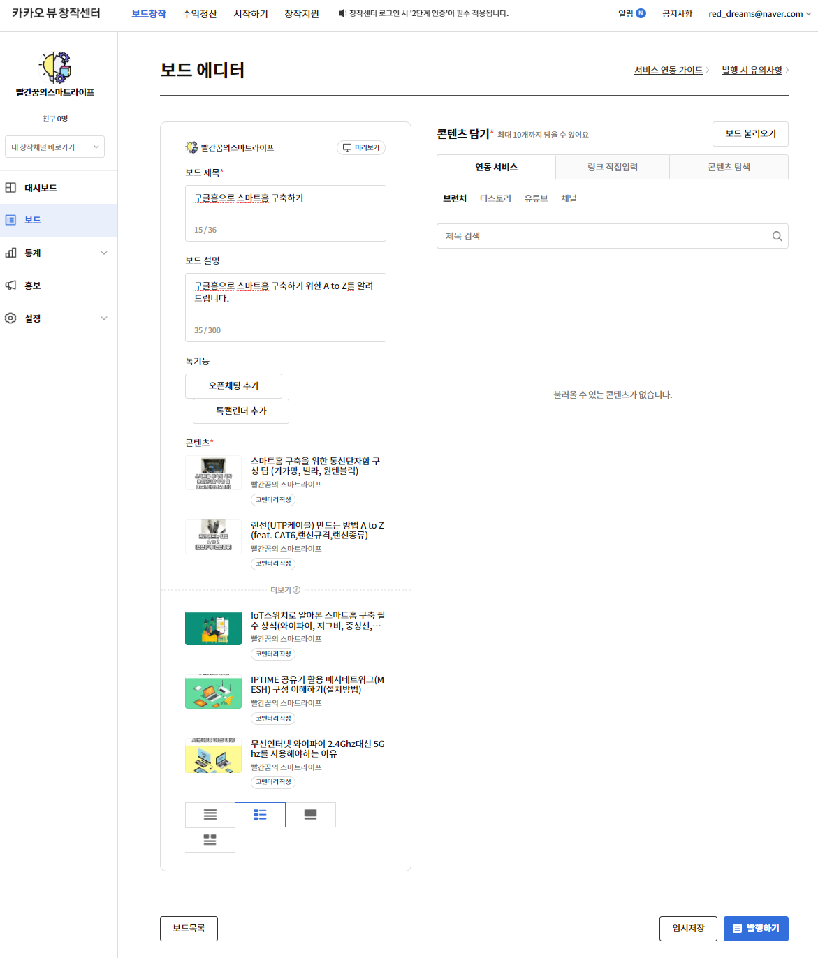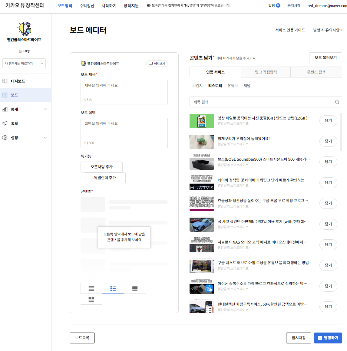 연동이 완료된 이후 곧바로 보드 발행을 해보도록 하겠습니다. 아래 보시는 것처럼 연동된 채널의 콘텐츠가 아주 편리하게 목록으로 즉시 노출됩니다. 여기서 원하는 콘텐츠를 '담기'버튼을 누르기만 하면 즉시 보드로 적용됩니다. 당연하겠지만 링크 직접 입력도 가능하고 콘텐츠 탐색 기능을 통해 카카오에서 제공하는 뉴스와 동영상도 전부 확인하고 담을 수 있습니다.