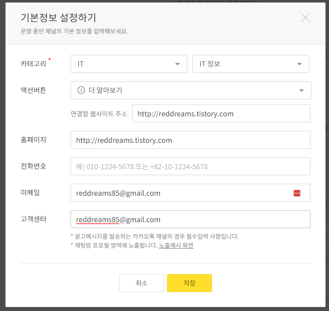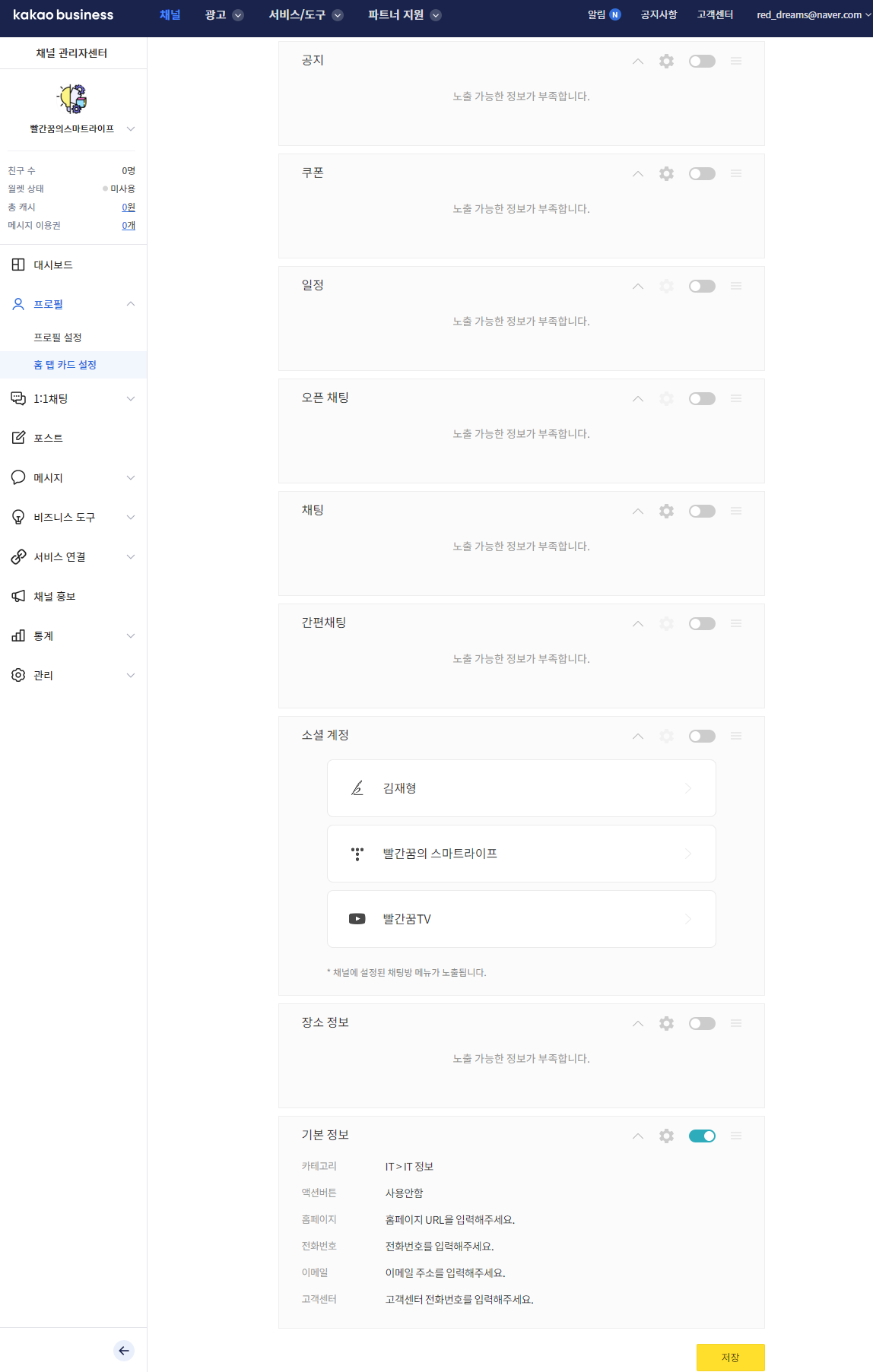 홈 탭카드 하단으로도 카테고리와 홈페이지(블로그 등), 이메일 등을 잘 입력해서 채널의 완성도를 한껏 높여줍니다.