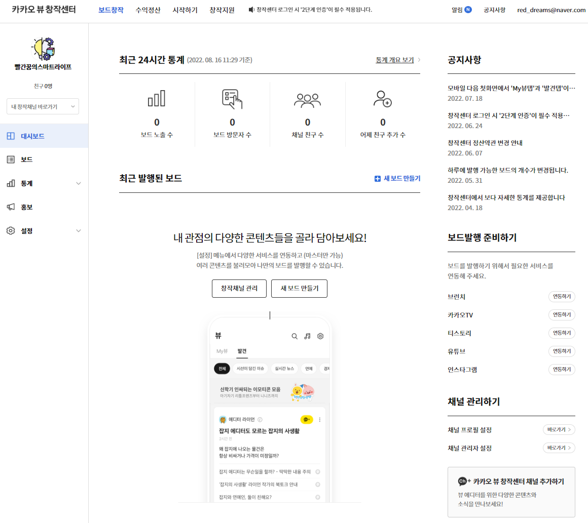 이제 생성된 채널의 창작센터를 확인하실 수 있는데요. 뷰 발행을 위해 가장 중요한 것은 바로 기존 채널 연동입니다. 아래 '보드 발행 준비하기'에 보시면 브런치, 카카오TV, 티스토리, 유튜브, 인스타그램 연동이 가능합니다. 연동하기를 눌러주세요.