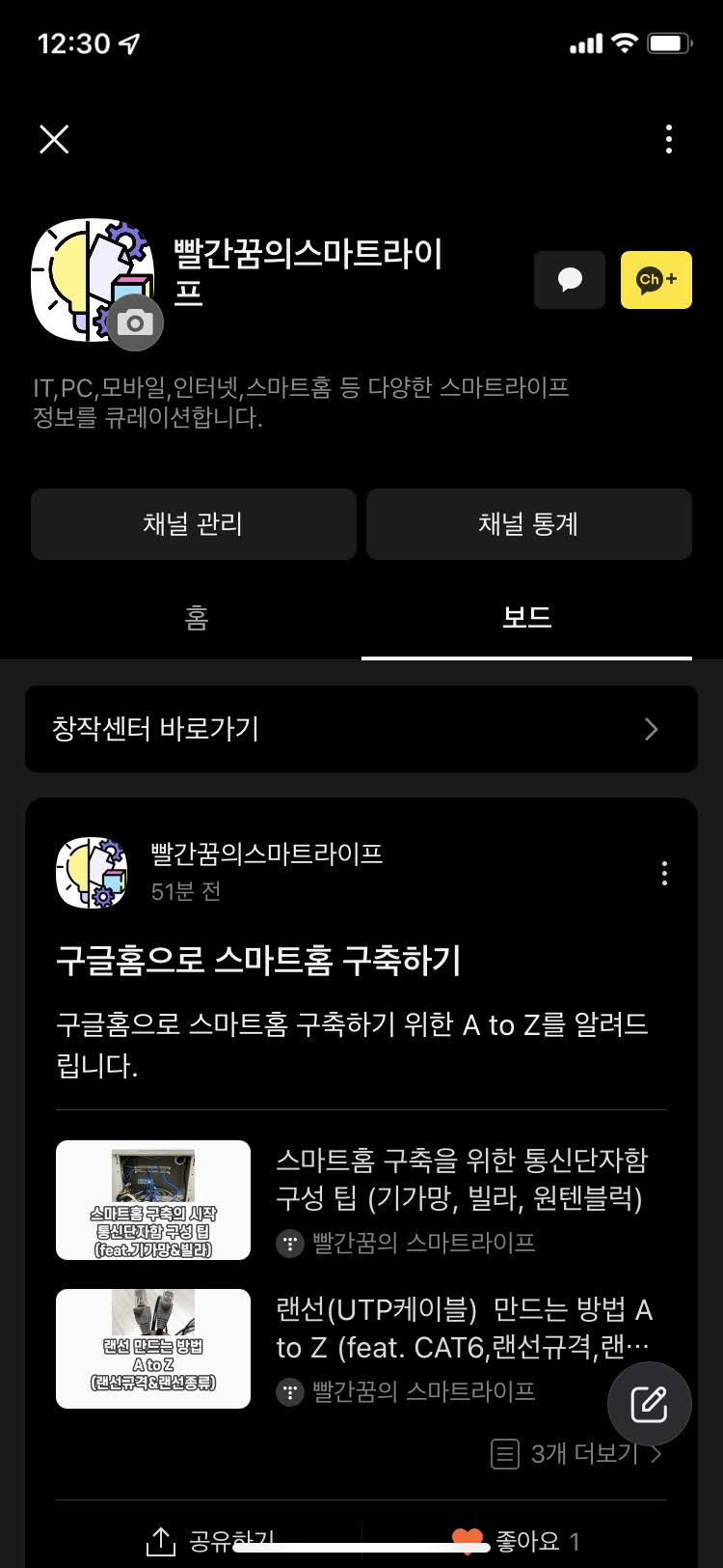 앞서 테스트 콘텐츠 1개를 발행했는데요. 언급해드렸던 것처럼 카카오톡에서 '내 채널명'을 검색하면 이제 카카오톡 채널과 뷰가 검색되고, 채널에 접속하면 홈 탭과 보드 탭이 노출됩니다. 참고로, 카카오톡 채널에서 '포스트'를 작성한다면 포스트 탭도 함께 노출되며 채널에서 채팅 기능을 사용 설정했다면 채팅도 활성화가 됩니다. 즉, 내 시간과 노력을 많이 기울일수록 카카오톡에서 내 채널과 발행 콘텐츠가 노출될 가능성이 높아지게 됩니다.
