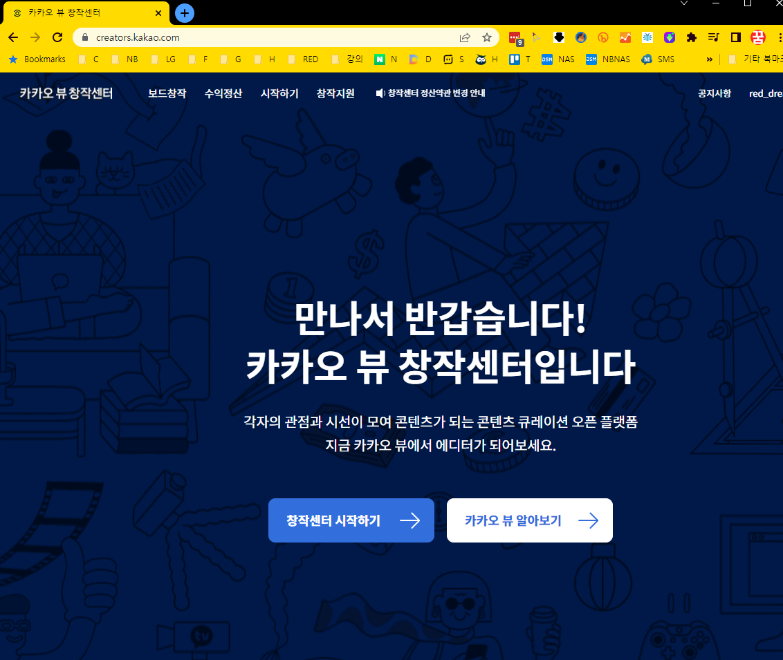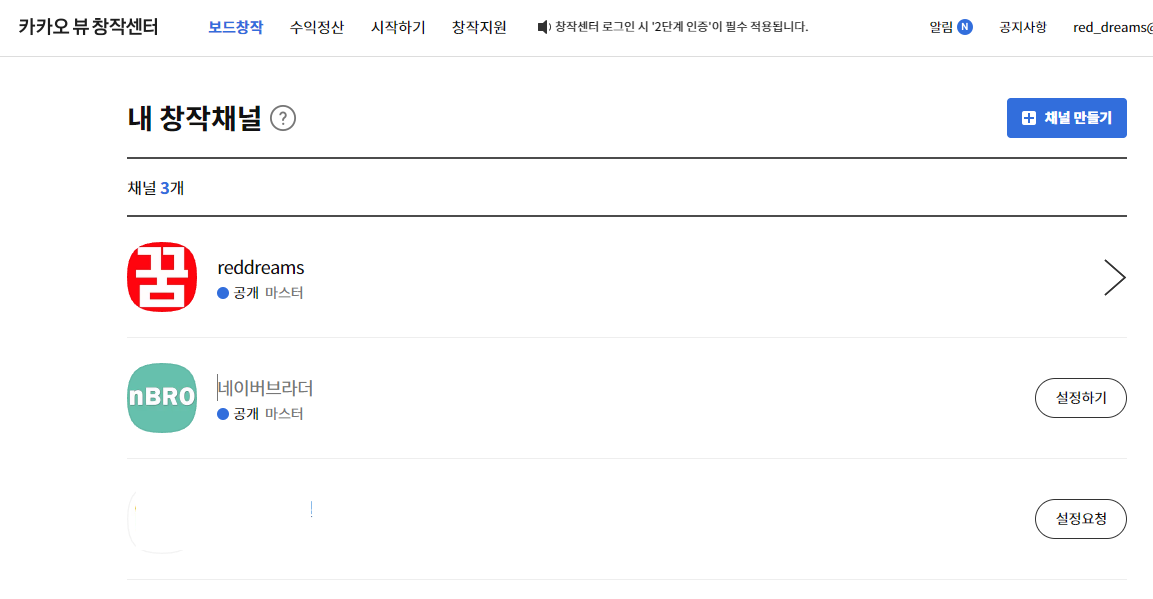 일단 위의 카카오뷰 창작센터에 접속해서 카카오계정으로 로그인하면 기본 준비는 끝나는데요. 카카오톡 뷰 보드 발행 서비스는 기본적으로 카카오톡 채널을 기반으로 하기에 카카오톡 채널이 존재해야 합니다.