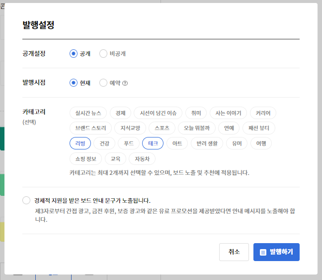 이제 '발행하기'를 누르면 공개 설정, 발행 시점, 카테고리를 지정할 수 있고 최종적으로 '발행하기'를 누르면 됩니다.