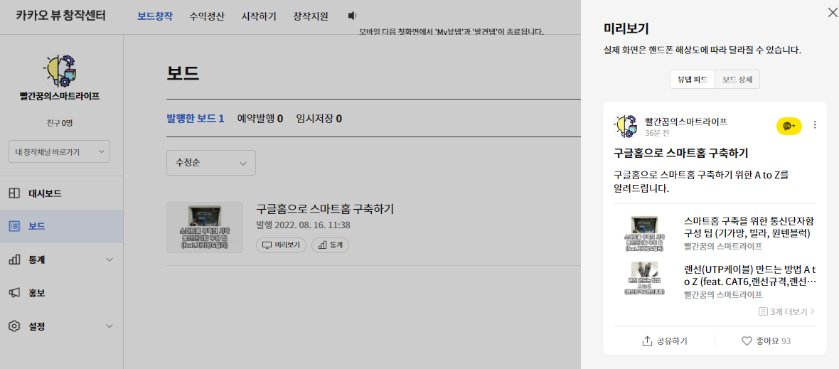 드디어 첫 번째 보드 발행이 완료되었습니다. 카카오톡 채널을 보유하고 있는 분들이라면 운영 중인 채널과 쉽게 연동하고 콘텐츠로 쉽게 불러와서 보드를 발행하는 것은 정말 10분도 되지 않는 시간으로 작업이 가능할 정도로 매우 간편하고 작업의 효율성이 높다고 할 수 있겠습니다.