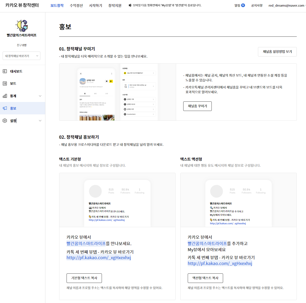 홍보 메뉴를 보면 창작 채널 꾸미기, 홍보하기 기능이 제공되는데 특별한 것은 없고 내 채널을 텍스트와 이미지로 조금 더 이쁘게 꾸밀 수 있는 기능이 제공됩니다.