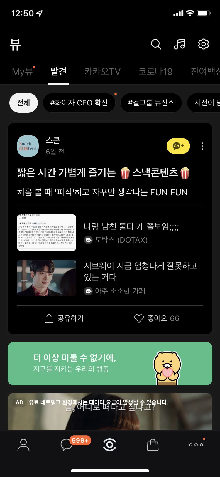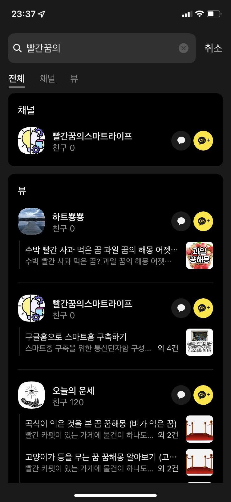 아래와 같이 카카오톡 앱 하단 중앙에는 눈 표시가 보이고 여기를 클릭하면 다양한 흥미, 유머, 지식, 정보 콘텐츠가 보입니다. 대부분 스낵 콘텐츠인데 클릭을 해보면 유튜브, 블로그, 카페 등 카카오의 다양한 서비스로 연동이 됩니다. 물론, 카카오 외 다른 서비스도 연동이 가능하지만 아무래도 자사 채널의 비중이 압도적으로 높습니다. 텍스트도 있고, 이미지도 있고, 영상도 보이는데 이 것을 우리는 카카오 뷰의 '보드'라고 부릅니다. 눈치채셨겠지만 꼭 내가 창작한 콘텐츠가 아니더라도 웹상에 있는 다양한 콘텐츠들을 잘 큐레이션 해서 발행하면 내 채널 활성화는 물론 해당 콘텐츠의 트래픽 확보에도 많은 도움이 될 겁니다. 누구라도 만들 수 있는 카카오톡 채널 뷰 서비스, 지금 바로 만들어보겠습니다.