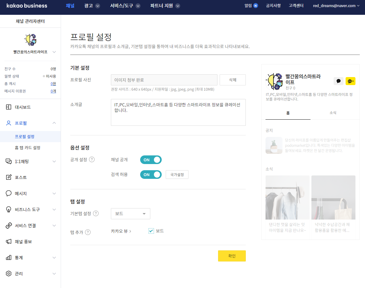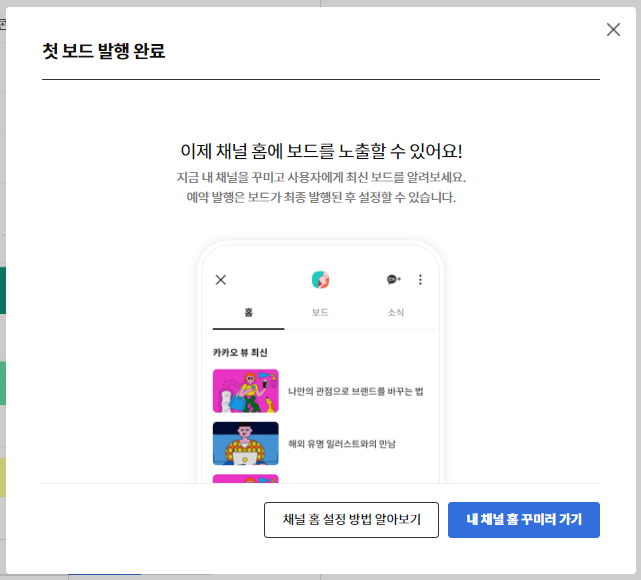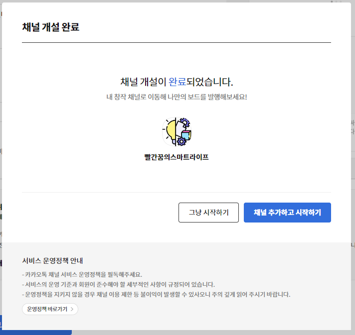 단 5분만에 보드 발행을 위한 카카오톡 채널 개설을 완료했습니다. 너무 쉽죠? 이제 다음 단계로 넘어가 보겠습니다.