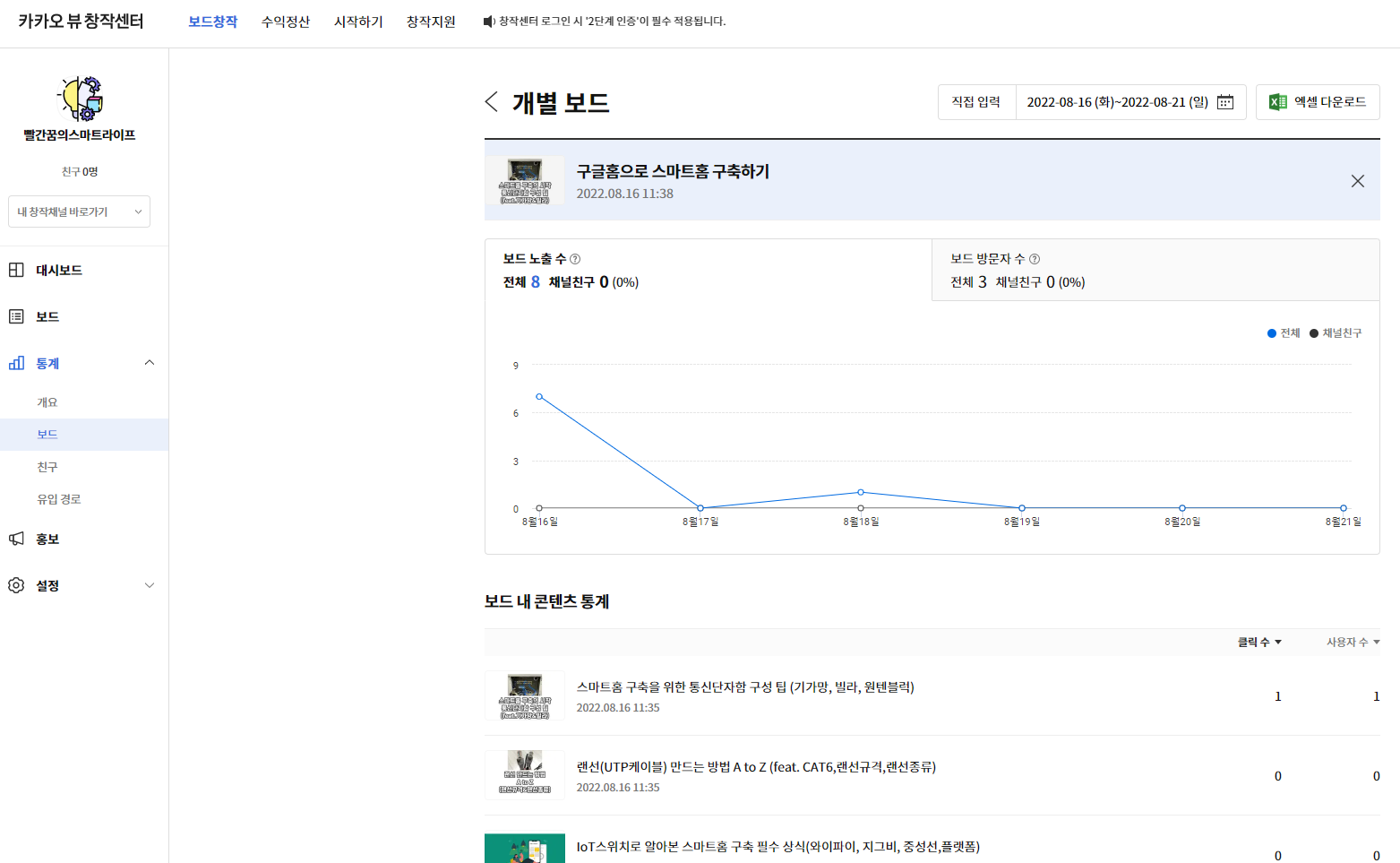 자 이렇게 발행된 보드 과연 효과가 어떨까요? 약 7일 뒤에 통계 메뉴를 확인해보았는데요. 기대하지는 않았지만 역시 테스트용으로 올린 거라 그런지 총 노출 8회를 기록했습니다. 사실상 현재는 아무런 노출 효과가 없다고 할 수 있겠습니다. 물론, 초반에 몇 번 꾸준히 콘텐츠를 올리고, 잘 큐레이션 해서 시선을 끌고 클릭하고 싶게끔 보드를 발행하면 분명 성과는 달라지겠지만 아무런 노력 없이 카카오 뷰를 운영하면 무조건 내 티스토리 블로그, 유튜브, 브런치 트래픽 확보에 무조건 도움이 된다라는 말은 성립되지 않는 듯합니다.