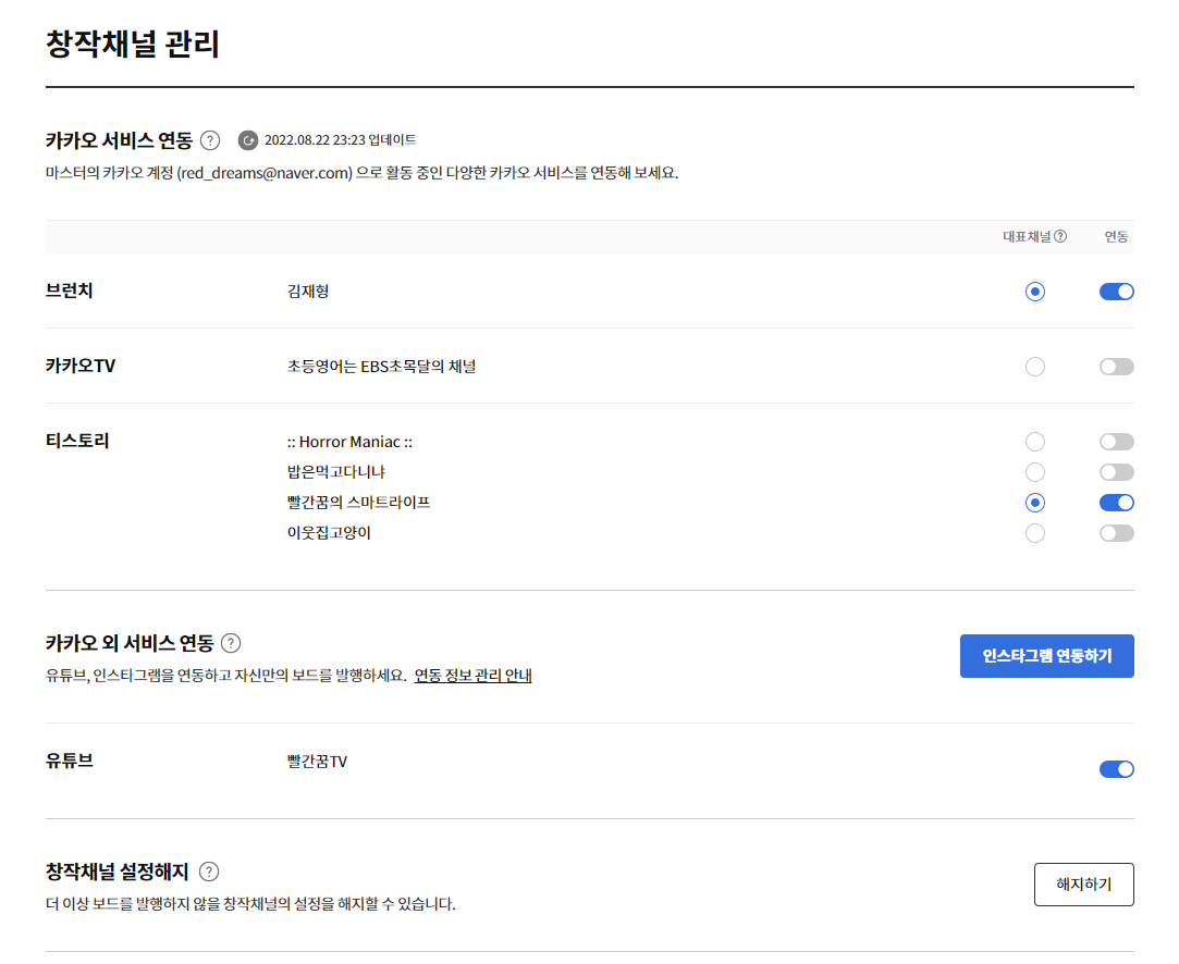 연동하기를 누르면 카카오 서비스와 연동되는 채널 목록이 나열됩니다. 여기서 보드로 발행할 채널들을 선택해서 연동해주시면 됩니다. 일단, 필자는 브런치, 티스토리, 유튜브 총 3개 채널을 연동해보았습니다.