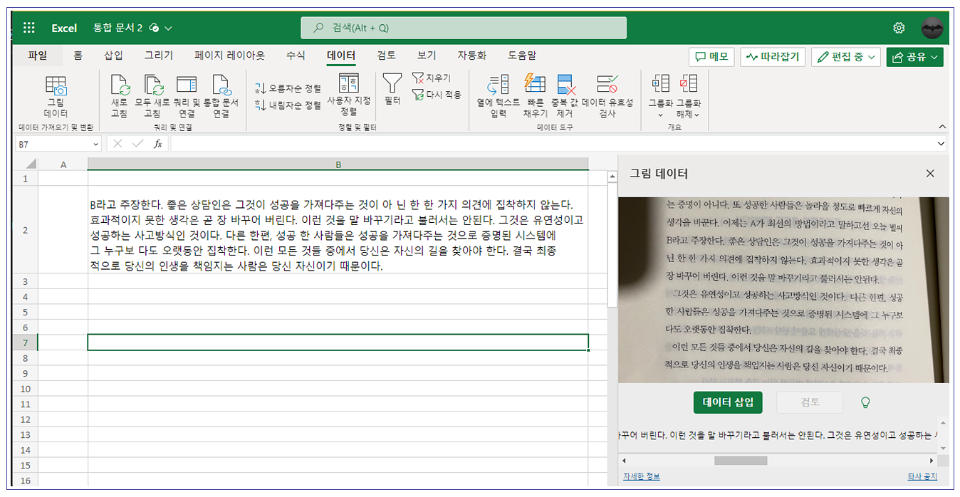 위에 예시를 든 이미지는 애초부터 그림이 아니라 문서가 그림으로 변환된 것이기 때문에 이렇게 정확도가 좋다라고 생각하시는 분이 있을까 봐 하나만 더 가져와봤는데요. 읽고 있던 책을 그냥 사진 찍어서 바로 위의 방법으로 엑셀로 불러와봤습니다. 오른쪽이 원본 카메라 이미지이고 왼쪽이 변환된 데이터입니다. 3번째 줄부터 변환이 되었지만 내용의 인식률이 일반 OCR(문자인식프로그램) 보다 더 우월하기 때문에 이 완성도 높은 그림데이터 기능을 사용을 안 할 이유는 전혀 없어 보입니다.