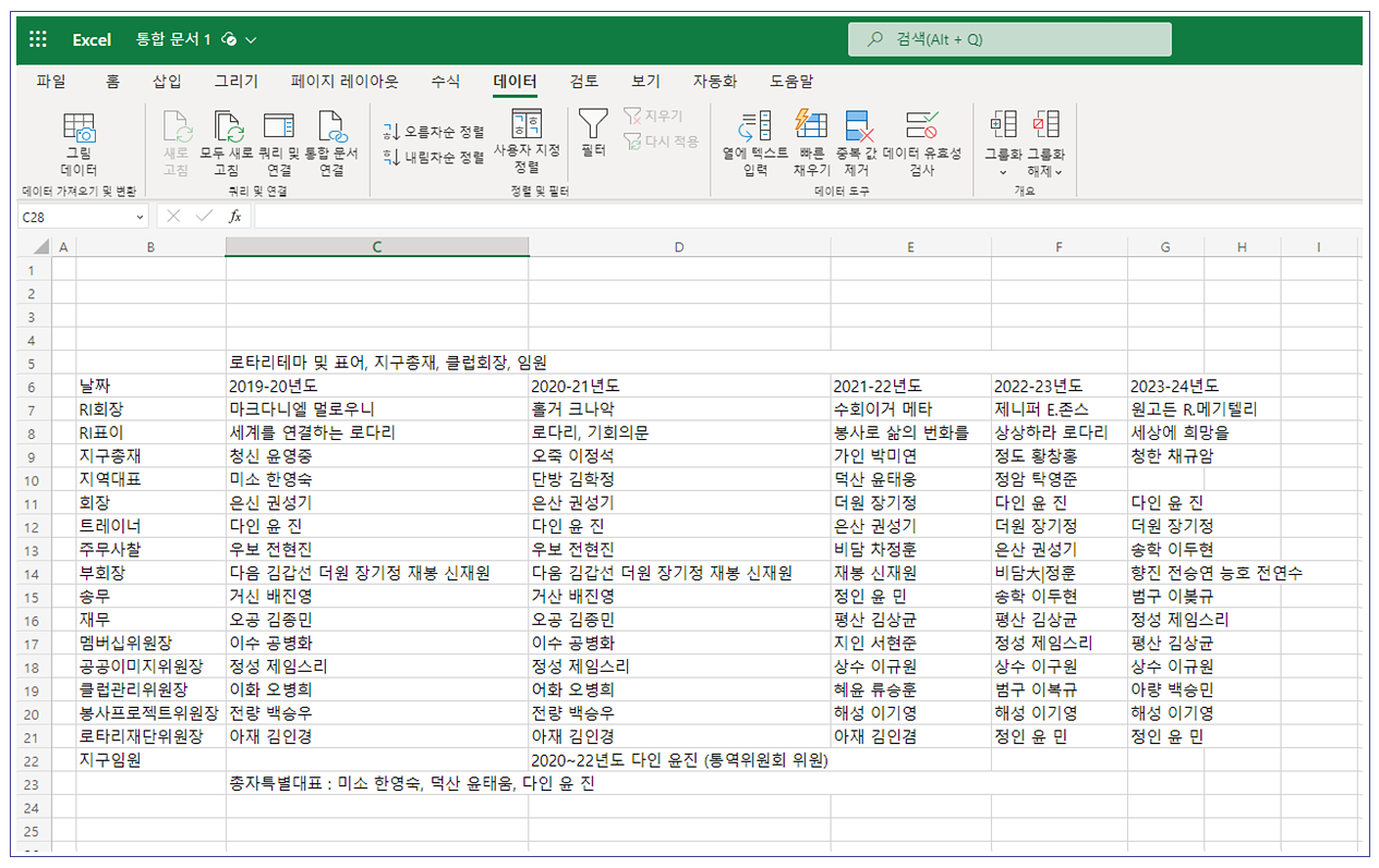 검수가 완료되었으면 '수락'을 누르면 이제 엑셀에 도표로 내용이 전부 채워집니다. 데이터가 채워진 만큼 도표 넣고, 정렬하는 것은 10초면 끝나겠죠?