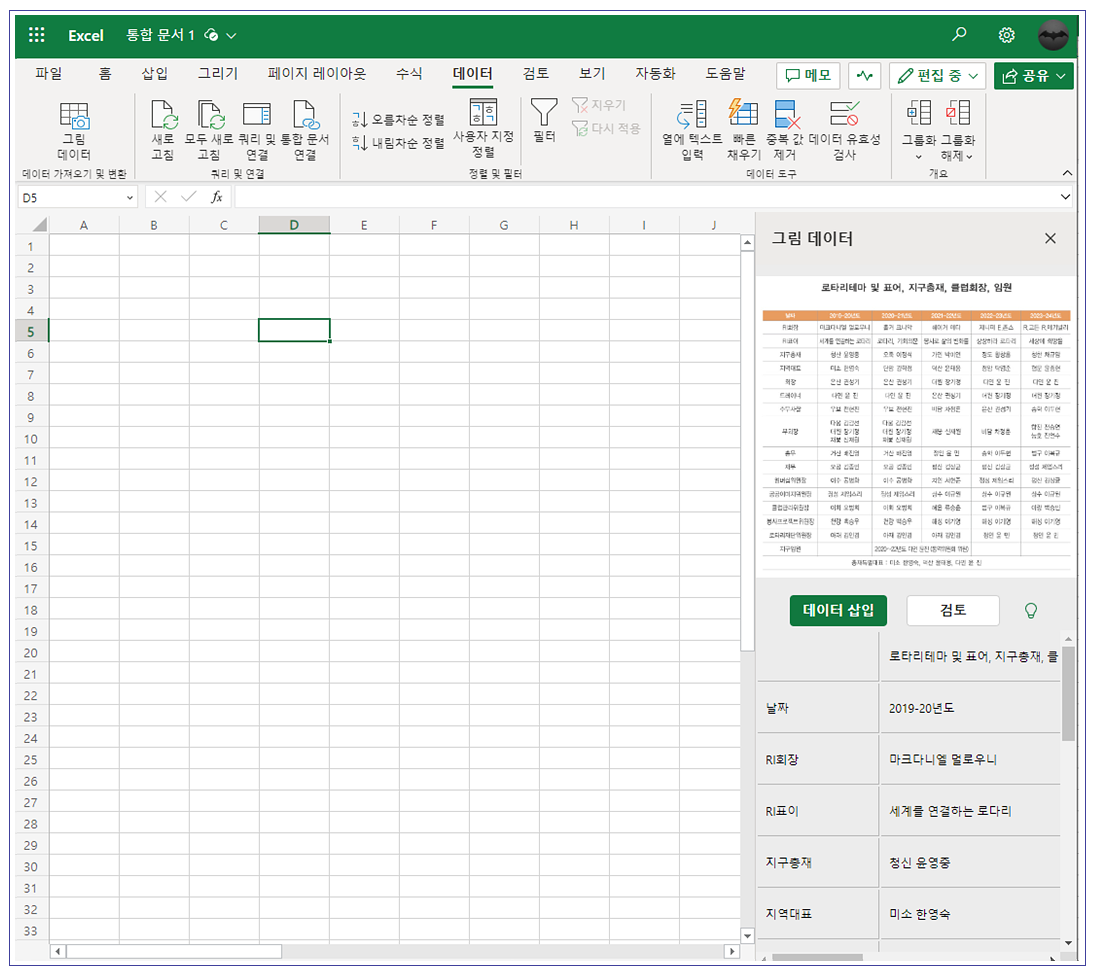 우리가 일상생활 또는 업무를 하다 보면 원본 문서가 없는 경우가 참 많이 발생합니다. 특히 업무생활에서는 PDF파일로는 있는데 원본이 없어서 편집을 못하는 경우도 정말 많이 발생하는데요. 이럴 경우 대부분 카메라로 사진을 찍거나 캡처를 해서 2차 활용을 하게 될 건데 이 작업이 여간 귀찮은 게 아닙니다. 이제부터는 식당에서 메뉴판을 찍거나, 조직도를 사진으로 찍거나, 행사 스케줄을 캡처하고 나서 곧바로 인터넷에서 MICROSOFT365를 열어서 '그림데이터'를 삽입해 보시기 바랍니다. 오늘 소개해드린 온라인 엑셀 그림데이터 삽입 기능은 충분히 완성도가 높고 활용도도 높은만큼 하루빨리 PC버전 엑셀에서도 적용되길 바랍니다. 그럼 다음시간에 더 유익한 IT꿀팁을 가지고 찾아오겠습니다.